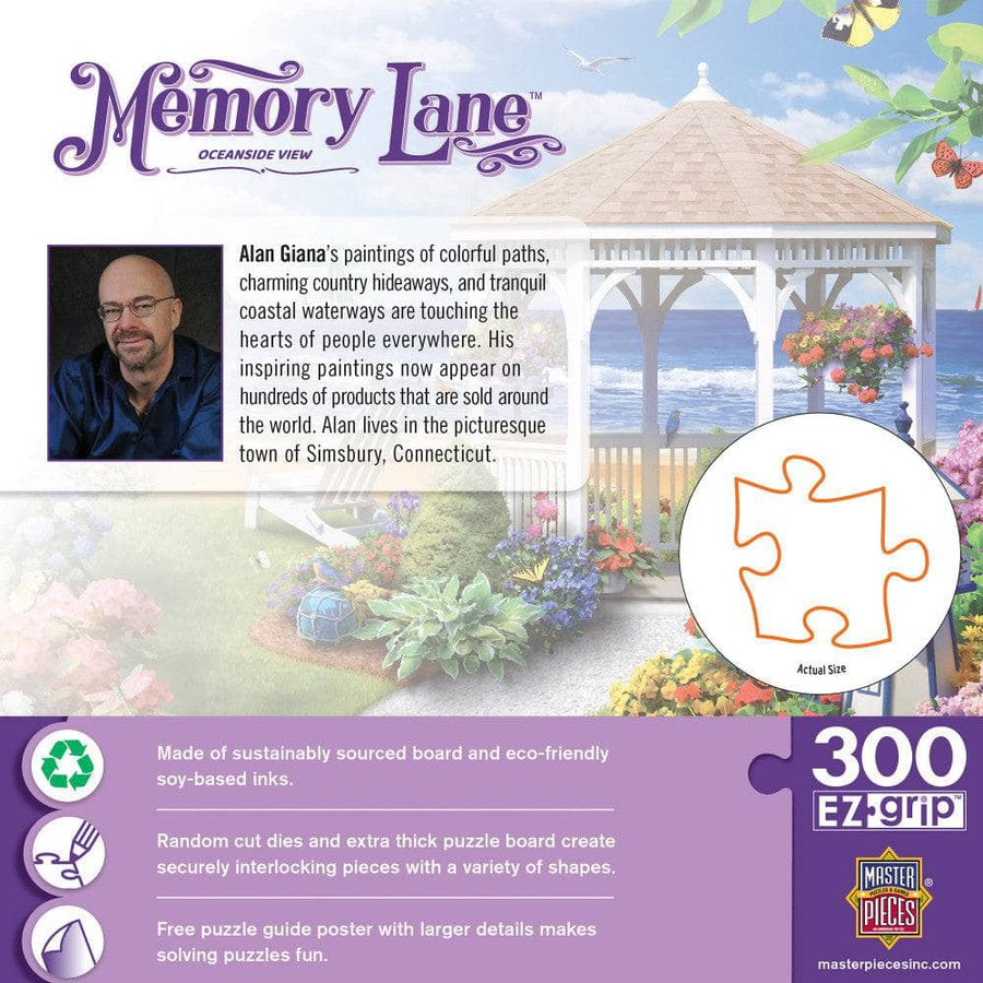 This MasterPieces 18" x 24" Memory Lane 300PC EZ Grip Puzzle depicts a beautiful gazebo, perfectly manicured with colorful flowers and plants, with a tranquil ocean scene in the background. It was painted by the talented Alan Giana, whose paintings of colorful paths, charming country hideaways, and tranquil coastal gateways are touching the hearts of people everywhere. His inspiring paintings now appear on hundreds of products that are sold around the world. Alan lives with his loving wife, Pamela, in the picturesque town of Simsbury, Connecticut. The EZ-Grip technology used to make this puzzle offers larger puzzle pieces that snap together perfectly, without compromising image quality. To reduce its impact on our environment, the chipboard used in this puzzle is made of 100% recycled material.