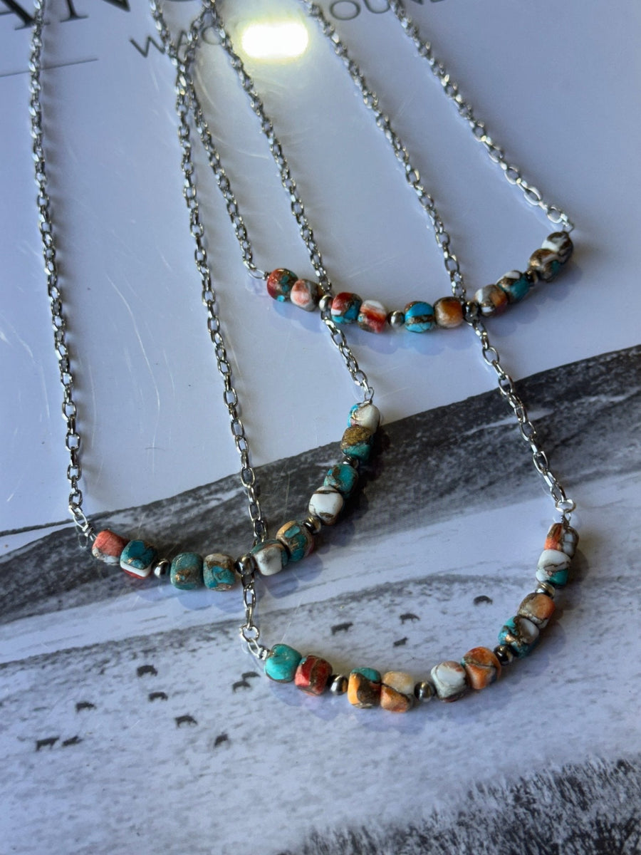 The Spiny Oyster Turquoise Beaded Chain Necklace is a vibrant blend of bold colors and Southwestern charm. Featuring alternating orange and turquoise beads on a delicate chain, this necklace adds a pop of playful elegance to any outfit. Perfect for brightening up your look with a touch of rustic style!