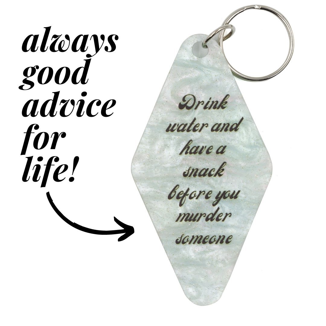 Marble mint keychain reads "Drink Water and Have a Snack Before You Murder Someone" in black script