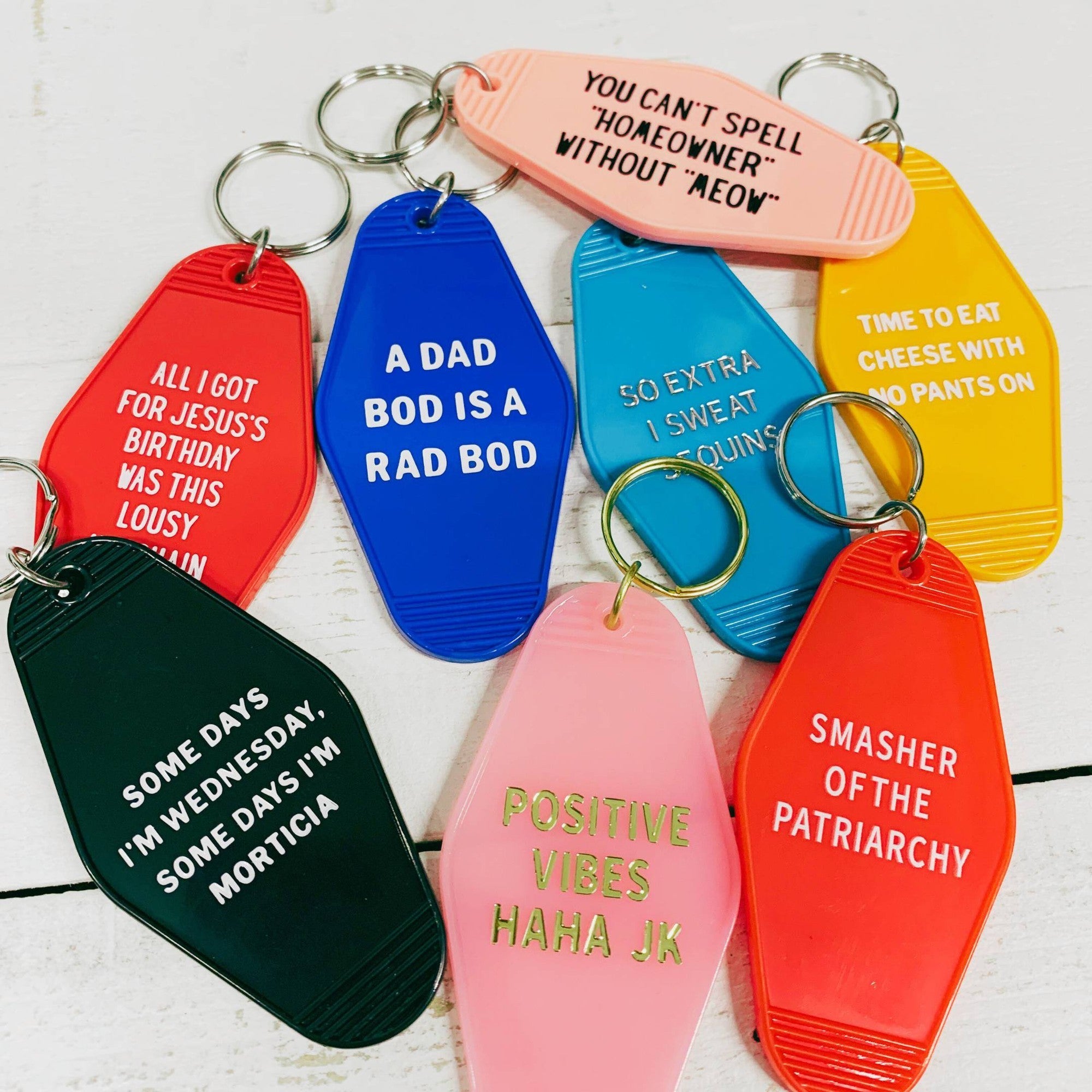 Motel style keychain reads: Positive Vibes Haha JK (just kidding) in gold lettering.