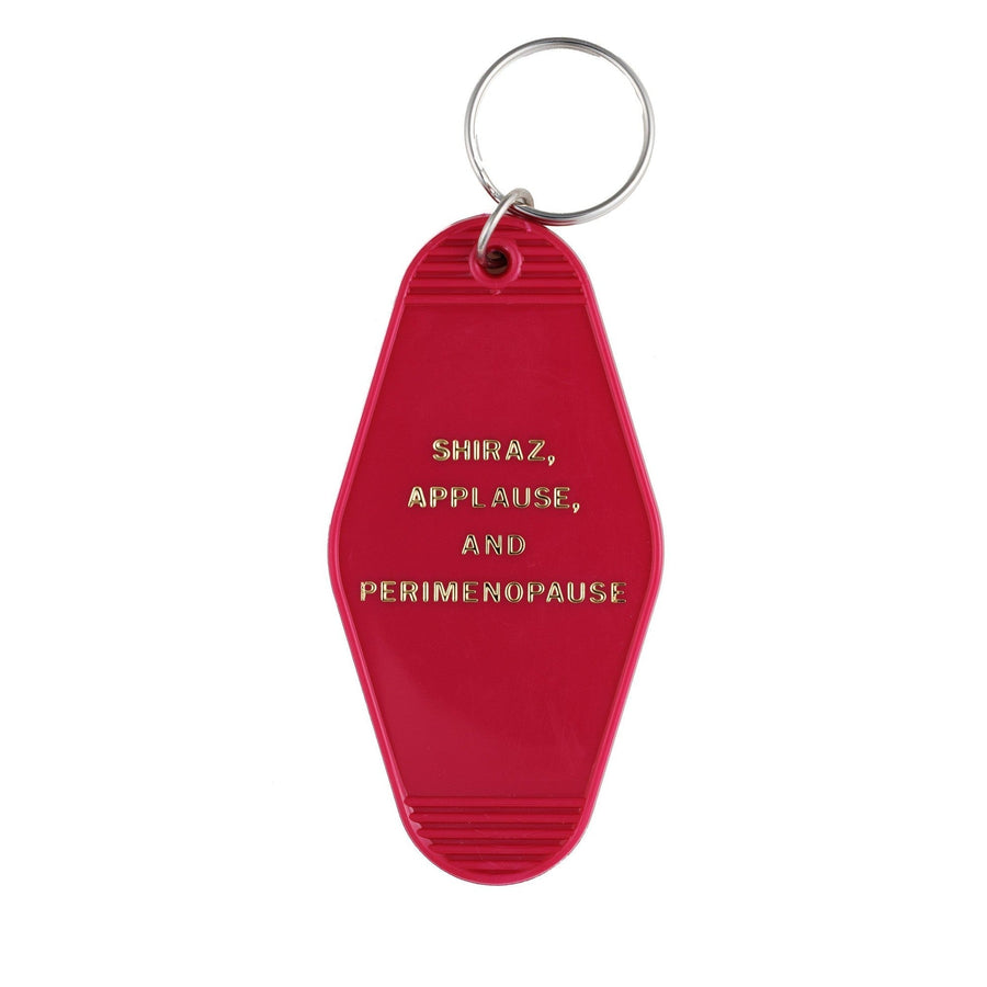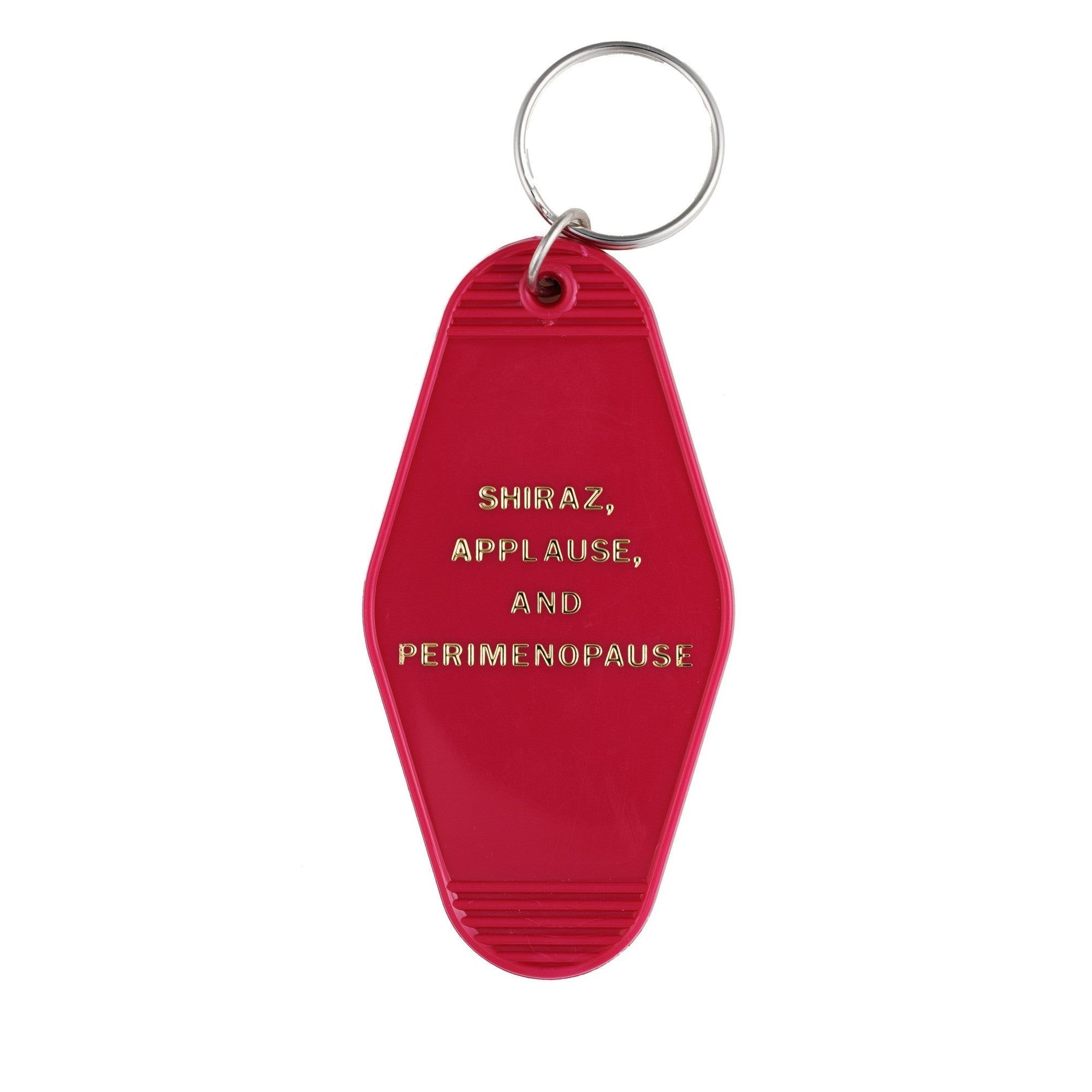 Keychain with gold type and silver hardware reads SHIRAZ, APPLAUSE, AND PERIMENOPAUSE. We call the color "hot flash fuchsia".