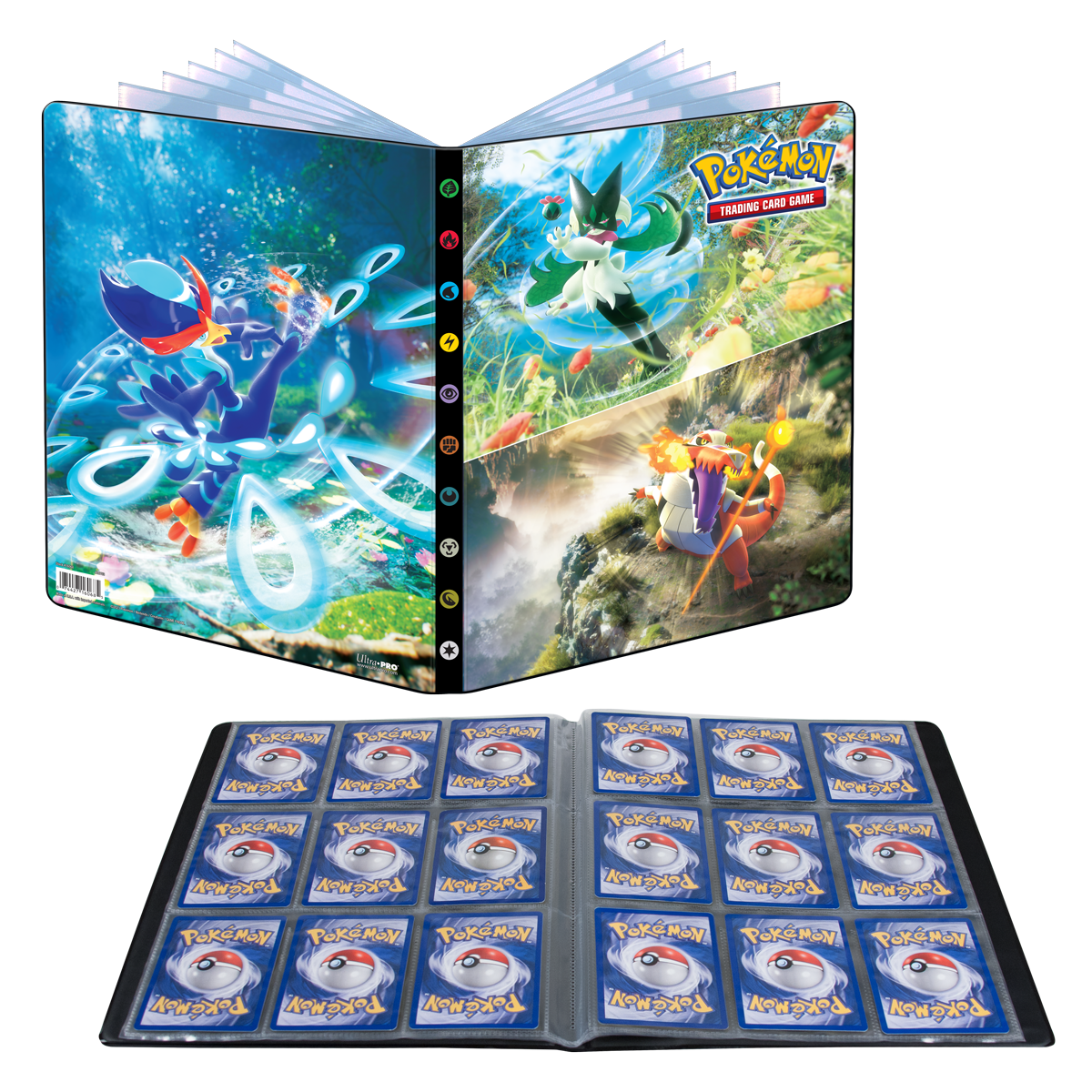 • Officially licensed Pokémon Trading Card Game 9-Pocket Portfolio featuring Skeledirge, Meowscarada, and Quaquaval from Pokémon Violet and Scarlet