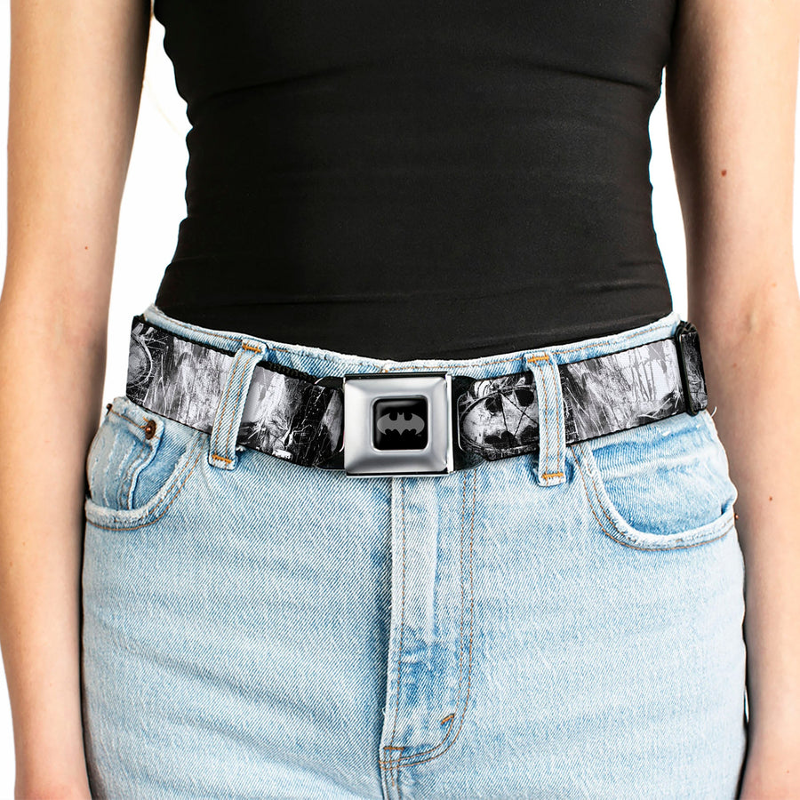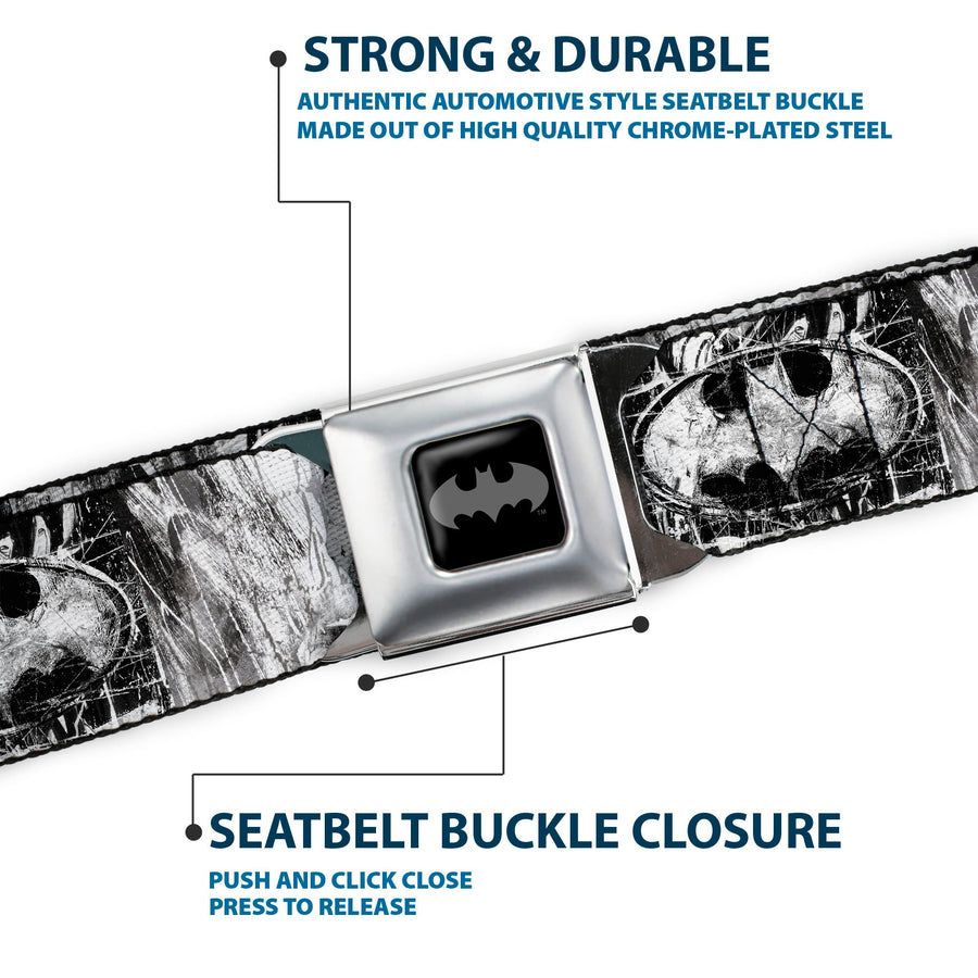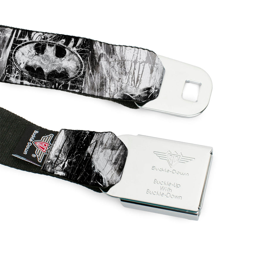 Batman Black Silver Seatbelt Belt - Batman Face/Bat Shield Sketch White/Black Webbing