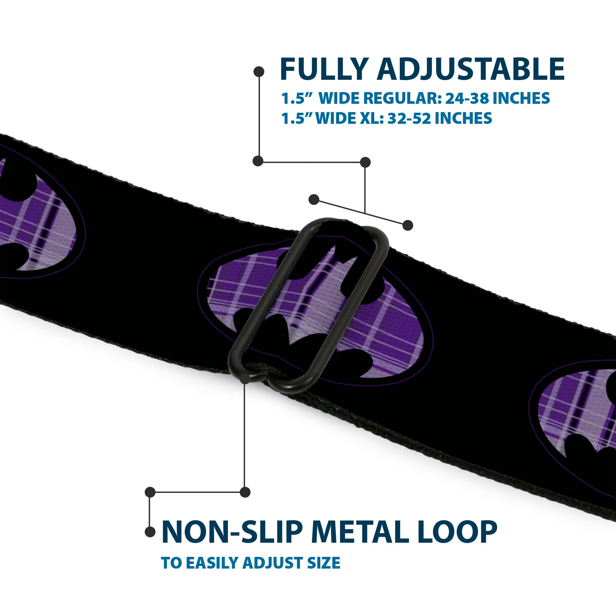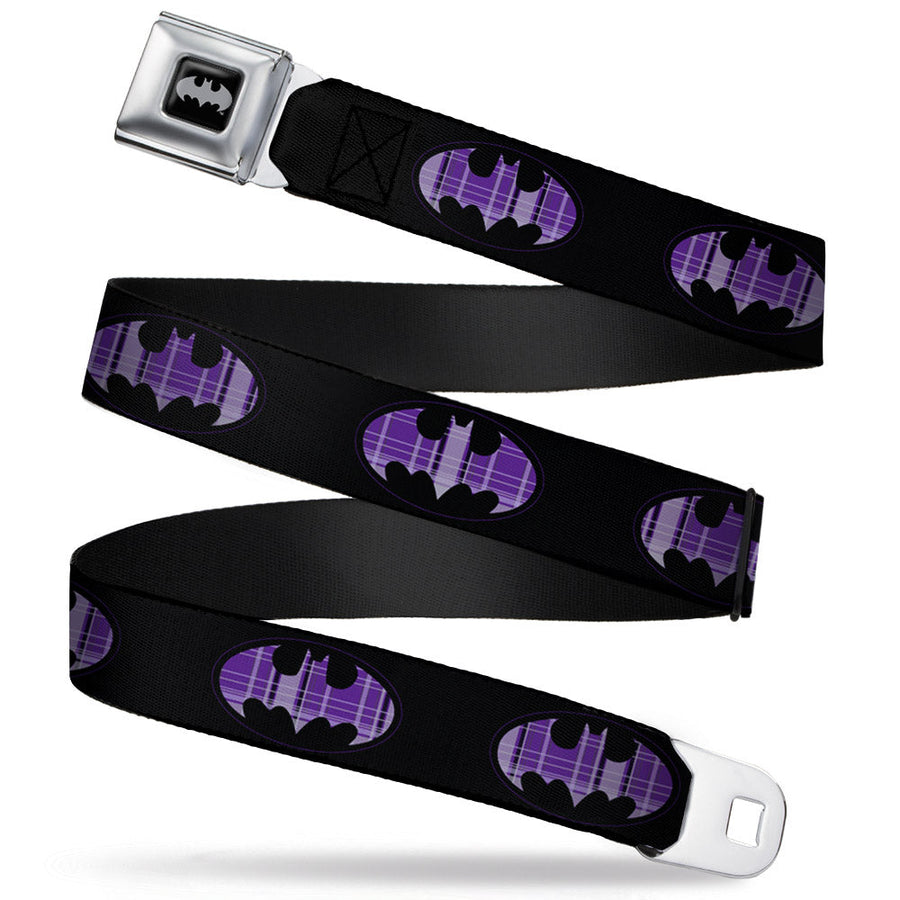 Batman Black Silver Seatbelt Belt - Batman Signal Black/Purple Plaid Webbing