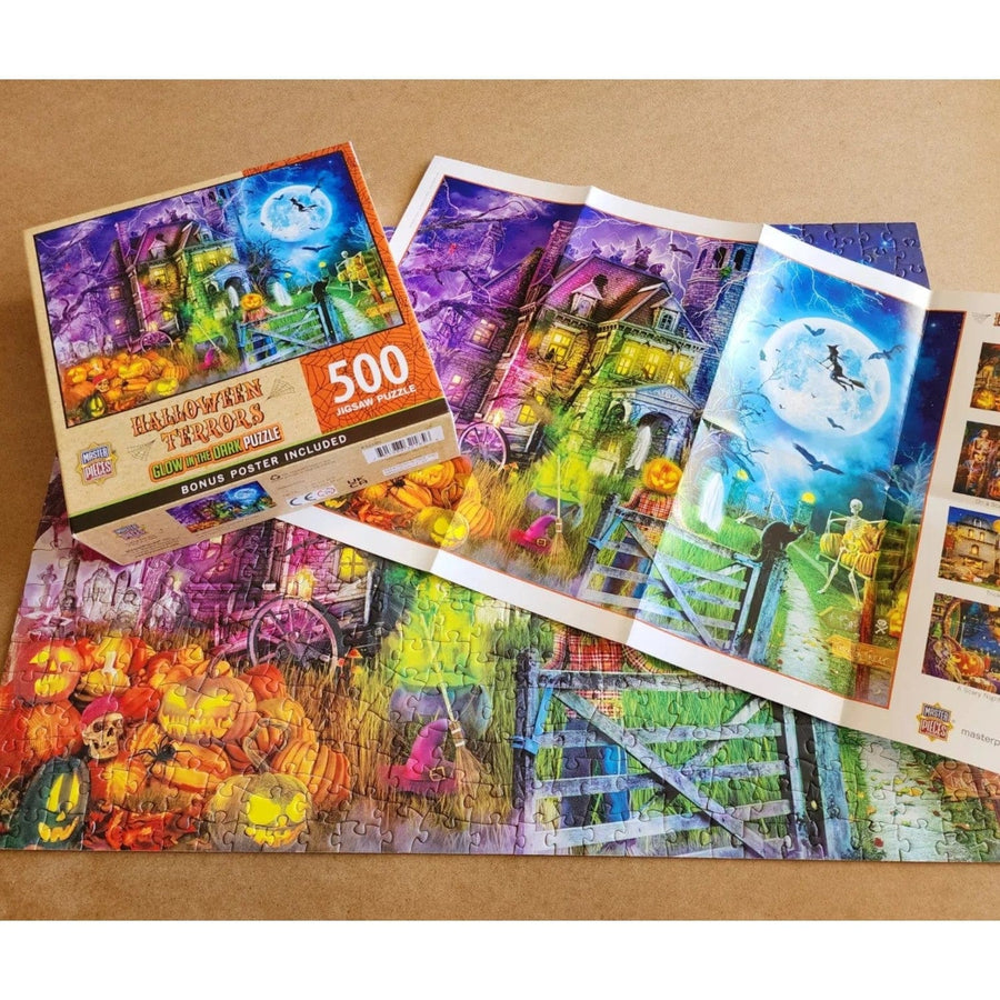 This MasterPieces 15" x 21" 500pc Halloween Glow in the Dark Puzzle is the perfect way to get into the holiday spirit, and the perfect Holiday present for friends and family. Celebrate spooky times and then turn off the light and watch it glow, if you dare. To reduce its impact on our environment, the chipboard used in this puzzle is made of 100% recycled material.