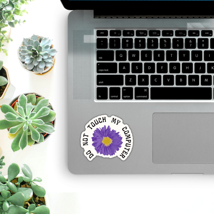 Glossy die cut sticker reads DO NOT TOUCH MY COMPUTER with a violet flower at the center.
