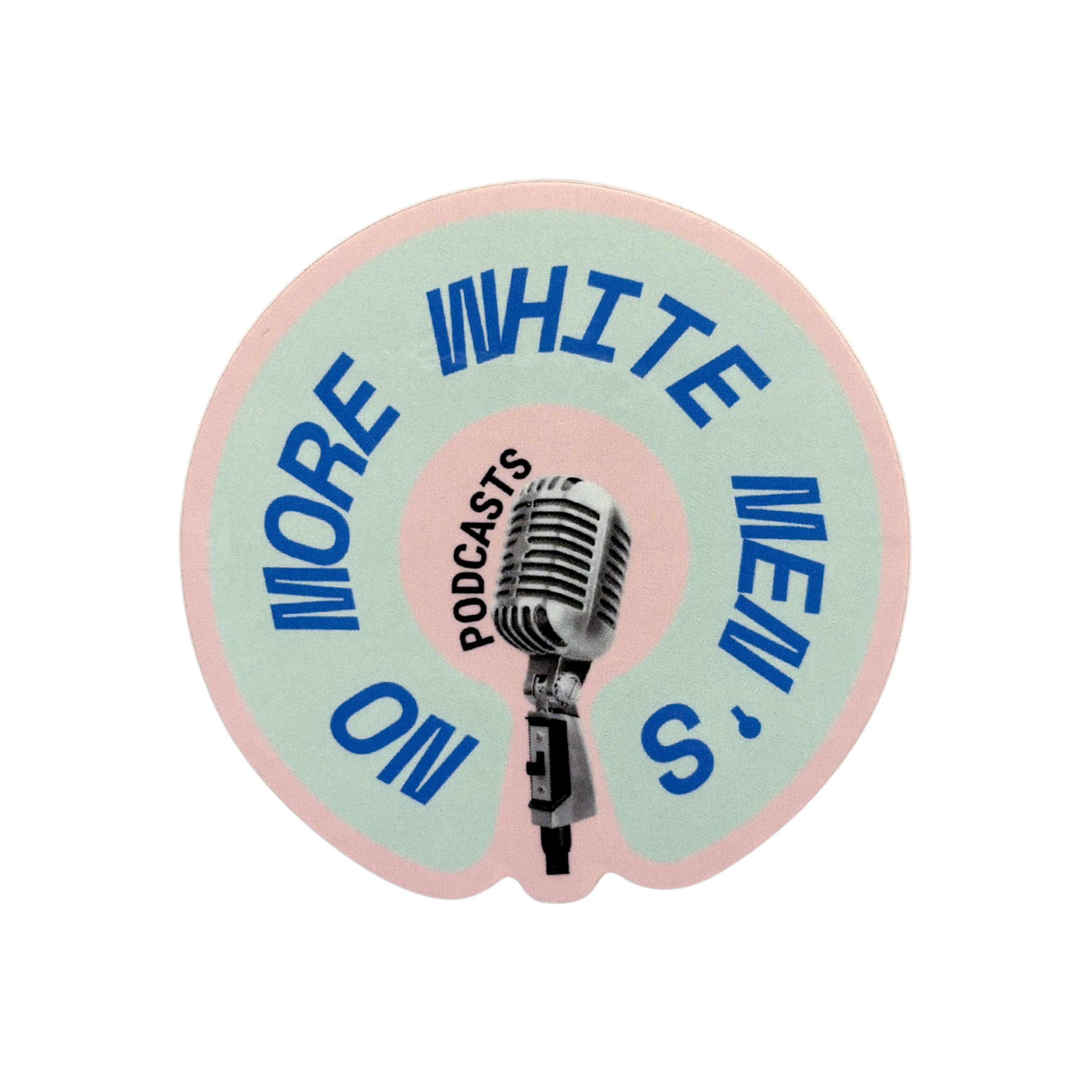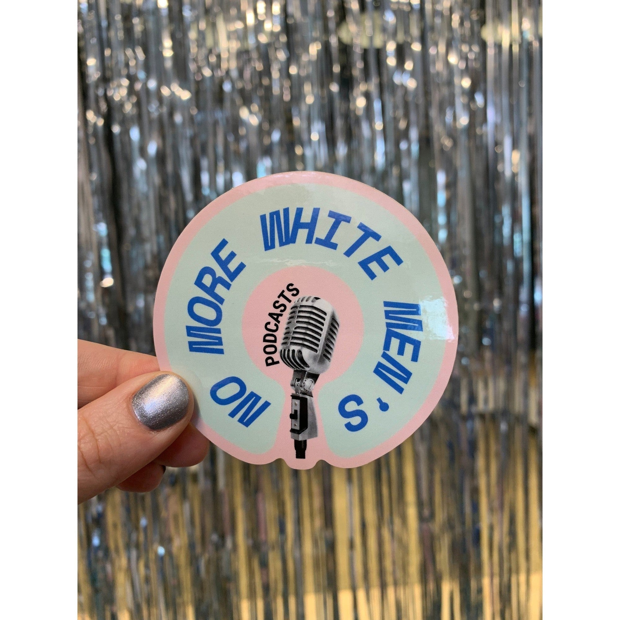 Glossy die cut sticker reads NO MORE WHITE MEN'S PODCASTS with vintage microphone at the center.