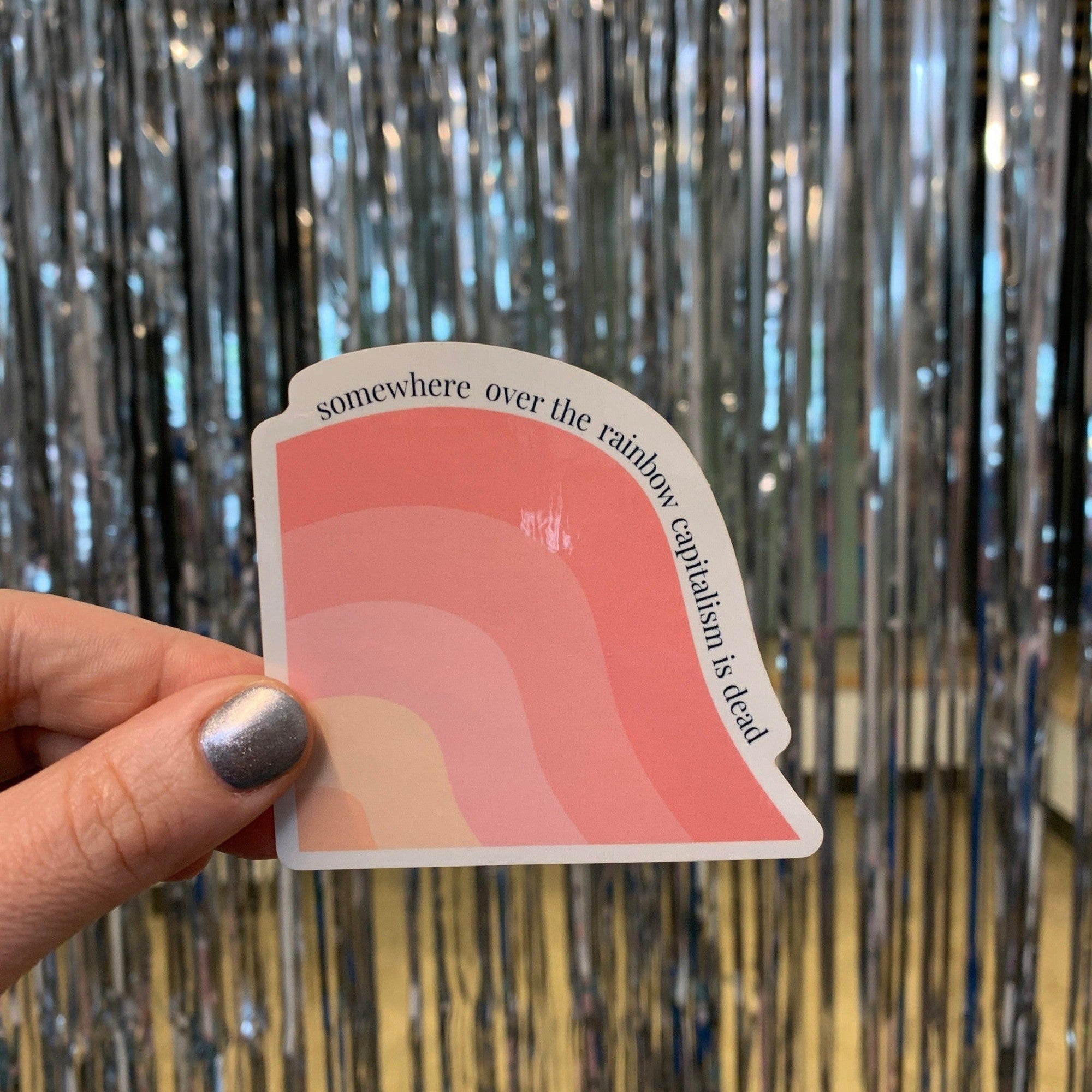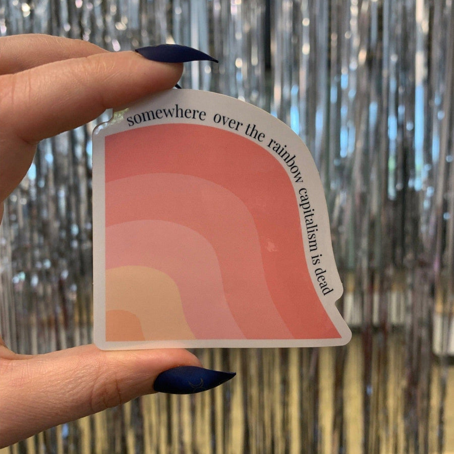 Glossy die cut sticker reads SOMEWHERE OVER THE RAINBOW CAPITALISM IS DEAD with rainbow in shades of yellow and pink.