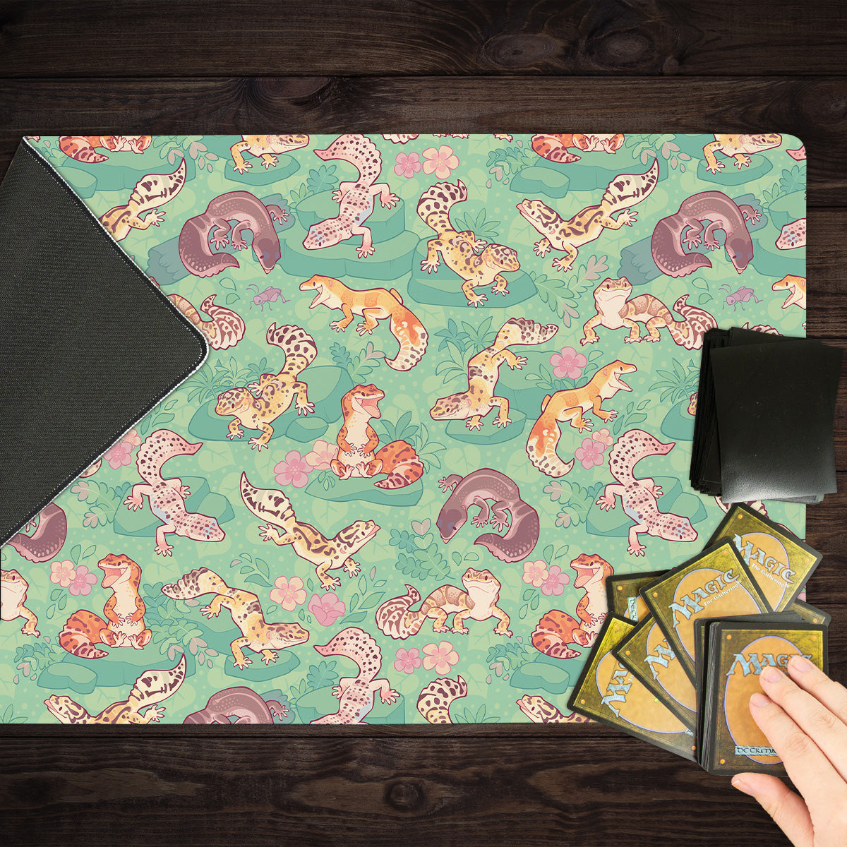 Oversized Playmat measures at 28” x 14” inches and is 1/16 of an inch thick. It’s made with a smooth cloth top and strong rubber backing.