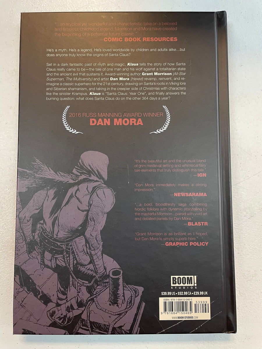 From BOOM! Studios. Klaus is "Santa Claus: Year One." Award-winning author Grant Morrison (All-Star Superman, The Multiversity) and Russ Manning Most Promising Newcomer Award-winning artist Dan Mora (Hexed) revamp, reinvent, and re-imagine a classic superhero for the 21st century, drawing on Santa's roots in Viking lore and Siberian shamanism. Collects the complete, seven-issue limited series in an oversized hardcover. This Local Comic Shop Day limited edition features unique silver foil stamping and spectrum foil gilding along the edge of the interior pages. Limited to 500 copies.