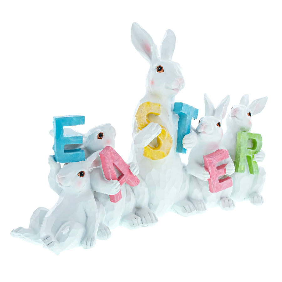 Embrace the joy and renewal of Easter with our charming 'White Bunnies Holding Easter Letters Figurine'. This delightful piece features a pair of playful white bunnies, meticulously crafted to bring a touch of whimsy and warmth to your holiday decor. Each bunny is carefully positioned to hold colorful letters that together spell 'EASTER', making this figurine a perfect centerpiece for your springtime celebrations. Made from high-quality materials, this figurine captures the essence of Easter with its detailed design and vibrant colors. Whether you're adding to your collection or gifting someone special, this enchanting decoration is sure to spread happiness and cheer.