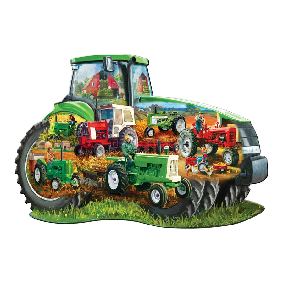 This 1000pc shaped puzzle is by farm artist Charles Freitag. Tractor shaped puzzle shows the harvest moments of the heartland. Includes three special shaped pieces hand-drawn into the dieline. To reduce their impact on our environment, the chipboard used in these puzzles is made of 100% recycled material.