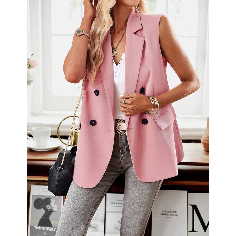 This chic, sleeveless design combines the sharp sophistication of a double-breasted vest with the modern flair of a collared blazer. Tailored to perfection, its structured fit and soft pink hue make it the perfect statement piece for both professional and casual occasions. Pair it with trousers or jeans for a sleek, fashion-forward look.