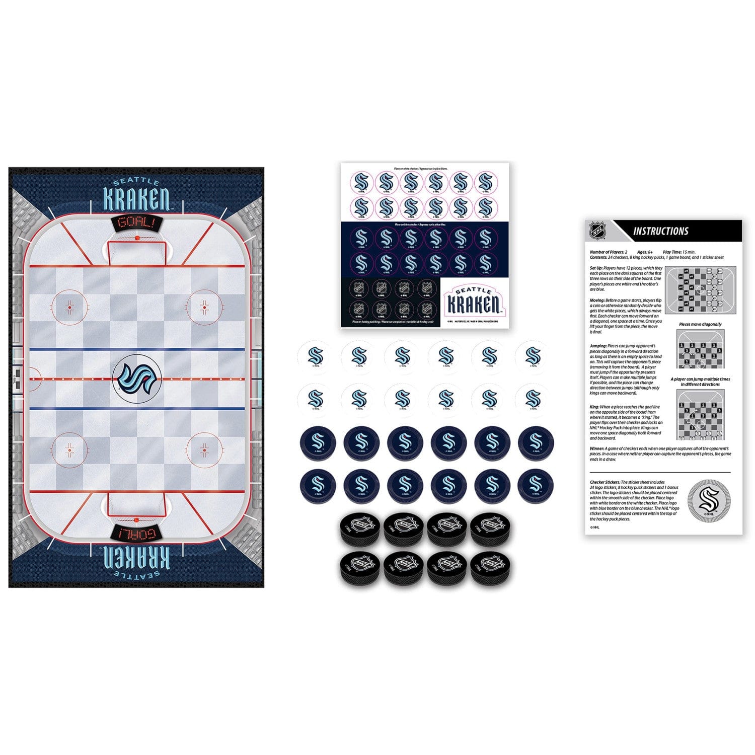 Bring the excitement of NHL action to your next family game night with this officially licensed Seattle Kraken checkers board game, designed for both kids and adults who love classic board games and hockey. Featuring a large 13" x 21" checker board crafted from durable cardboard and plastic, this set is perfect for fans seeking Seattle Kraken merchandise or looking to add a unique twist to their board games collection. The set includes everything needed for play, making it ideal for board games family night or as a gift for hockey enthusiasts. The checker board game is easy to assemble and suitable for ages 6 and up, offering hours of strategic fun for families and friends. Whether you’re searching for a big checkers board game or a checkers game kids will enjoy, this edition stands out with its vibrant team colors and NHL-themed design. Lightweight at just 1.1 pounds, it’s easy to store and transport, making it a great choice for gatherings or travel. This board game is a must-have for fans of the Seattle Kraken, and a great alternative to wooden checkers board game sets or other sports-themed games like NHL Opoly or NFL board games kids. No batteries required.
