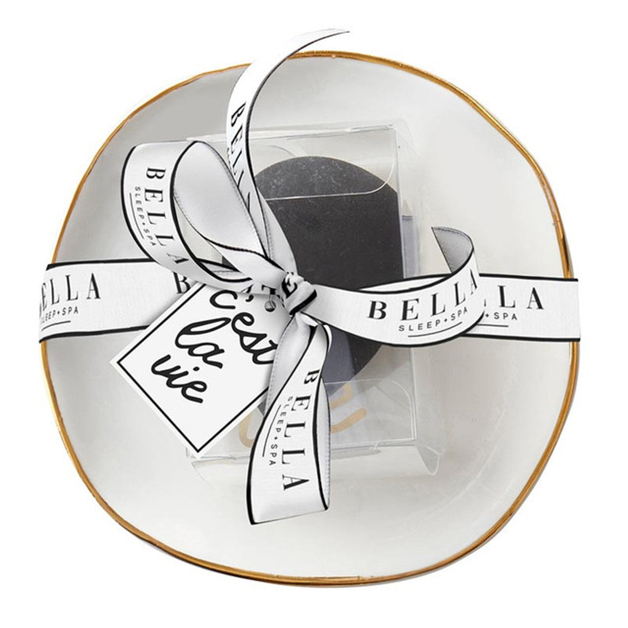 - Ceramic tray reads: "C' Est La Vie" in gold print on ivory ceramic with a gold rim