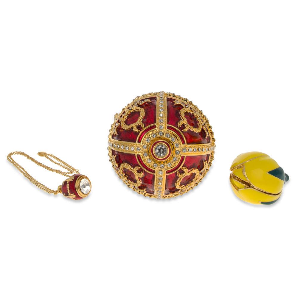 The egg opens like a bonbonniere to reveal a yellow-enameled rosebud with a royal egg pendant necklace.