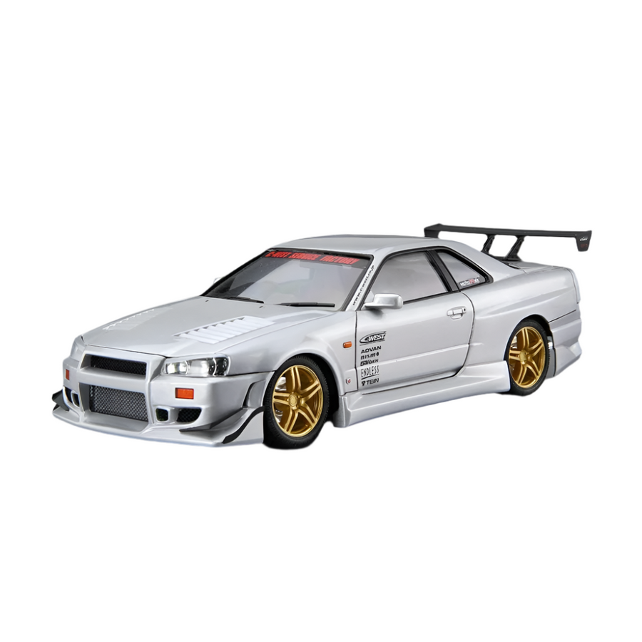Rebuild the sleek Nissan (2002) C-West BNR34 Skyline GT-R 1/24 Scale Model Kit in 1/24th scale with Aoshima's collectible model kit!