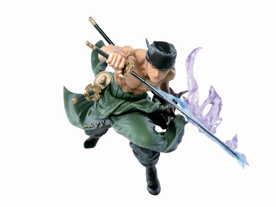 From the anime series One Piece, the Ichibansho Professionals Roronoa Zoro stands about 4 inches tall and is sculpted for battle.
