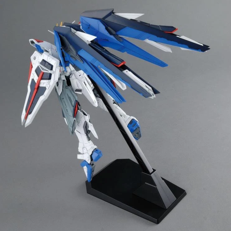 An updated version of the Freedom Gundam from "Gundam Seed" that features stylized detail and proportion influenced from the MG RM Aile Strike Gundam. All weapons have carefully recreated including beam rifle, beam sabers that can combine, rail cannons, and plasma cannons. Sliding armor panels in thighs and forearms and flip open hatches in wings allow new possible dynamic display options. Display stand included. Runner x 16, Dry Transfer, sticker, instruction manual.