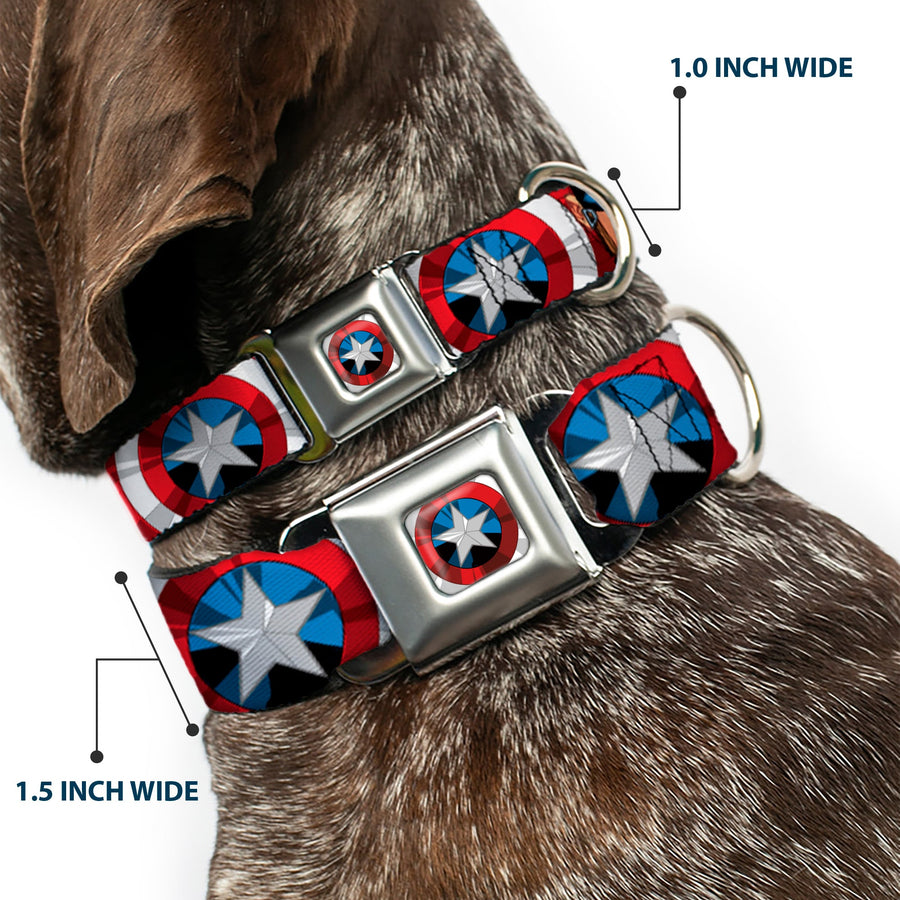 Your dog will be the talk of the town when people notice they're wearing this awesome SeatBelt Dog Collar! Made from high-density polyester and durable steel components, this collar is built to last. It features beautiful vibrant artwork. The buckle is a miniature authentic SeatBelt Buckle, so you press the center button to release the clasp. This product is Made in USA by Buckle-Down Inc. and officially licensed by Marvel Comics.