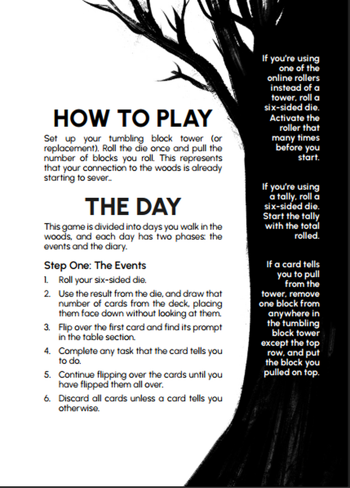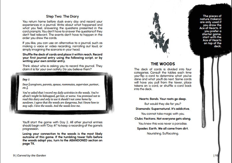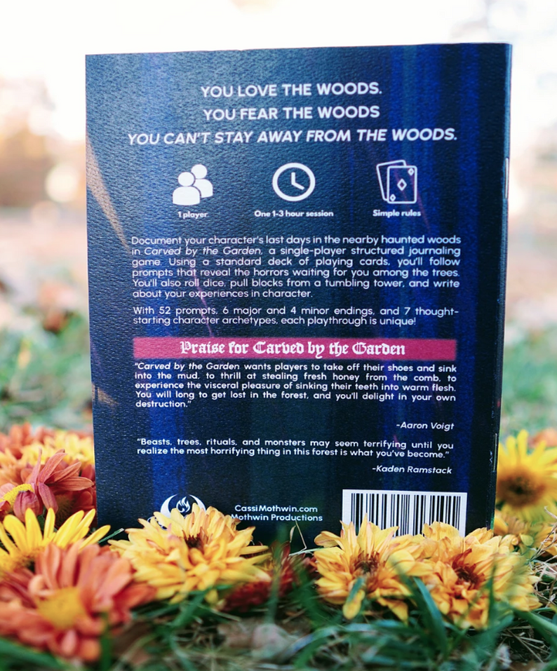 "Carved by the Garden" is a hauntingly captivating solo journaling RPG that invites you to explore the enigmatic and eerie depths of a haunted forest. Inspired by folk horror stories such as "The Witch," "The Ritual," and "Midsommar," this game melds self-reflection with spine-chilling discoveries, perfect for those who revel in the mysterious and the macabre. As you document your character's ill-fated days in the woods, you will engage with a standard deck of playing cards to uncover 52 unique prompts that drive your narrative forward. Additional gameplay elements include rolling dice, pulling from a tumbling block tower, and placing tokens to deepen the interaction with the game's world. Each playthrough promises a unique adventure with six major and four minor endings, supported by seven thought-provoking character archetypes. Whether you are a fan of RPG storytelling, horror narratives, or the thrill of crafting your own dark lore, "Carved by the Garden" provides a profound solo experience that explores the thin line between fear and fascination.