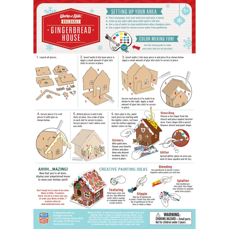 This Buildable Gingerbread House Wood Craft & Paint Kit is made of real wood, and includes everything you need to create a beautiful work of art! The Gingerbread House Wood Craft & Paint Kit is the perfect gift for every art loving kid! It includes 1 unassembled gingerbread house, 1 sticker sheet, 1 stencil sheet, 1 tube of glue, 7 non-toxic acrylic paint tubs, 1 non-toxic glitter glaze tub, 1 artist-quality paintbrush, 1 instruction sheet with painting guide.