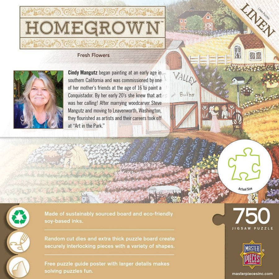 This MasterPieces 750pc Homegrown Puzzle of Fresh Flowers features tons of flower beds surrounding this farmers property. This folk art collection features the talented work of Art Poulin. This puzzle is made of linen material which makes it easier to grip and see with no-glare. This linen puzzle is the perfect gift for any puzzle lover! To reduce its impact on our environment, the chipboard used in this puzzle is made of 100% recycled material.