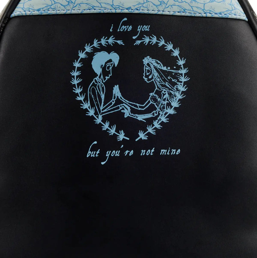 Who will be next to catch the bride’s bouquet? The Loungefly Corpse Bride Emily Bouquet Mini Backpack proves that romance isn’t just for the land of the living. On the front zipper pocket, dusty blue roses make up a floral arrangement for Emily’s wedding day. Up above, Emily gazes down at the bouquet from behind her mesh bridal veil. Maggot joins in the celebration as an enamel zipper charm, providing easy access to any essentials. Turn the bag around to find critters printed along the bag’s side panels while a blue rose motif continues onto the backpack straps.
