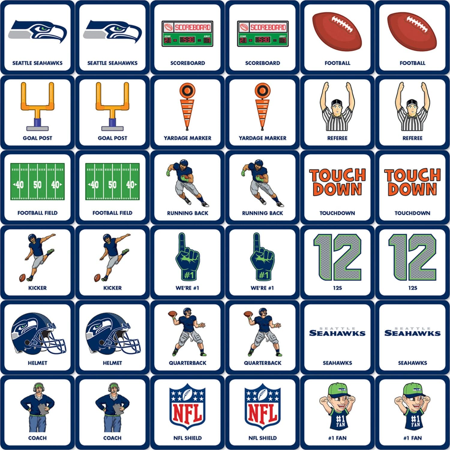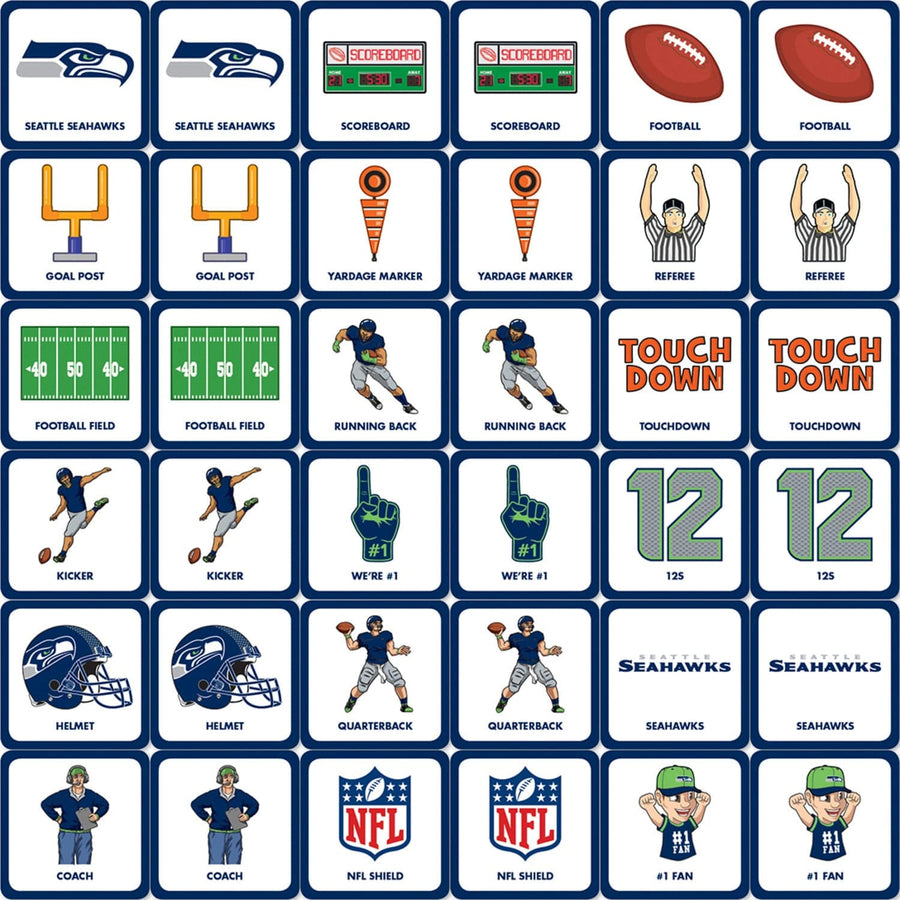 Looking for a fun way to spend some time with the family? Look no further than the NFL Seattle Seahawks Matching Game. This exciting game puts a sports spin on the classic matching game, and is perfect for children, adults, and families of all ages. With 18 unique pairs of symbols, it's sure to keep you entertained for hours on end. Plus, the officially licensed NFL picture cards are made with high-quality stock for durability and lasting enjoyment. So grab a partner and get ready to test your memory and sports knowledge with the NFL Seattle Seahawks Matching Game!