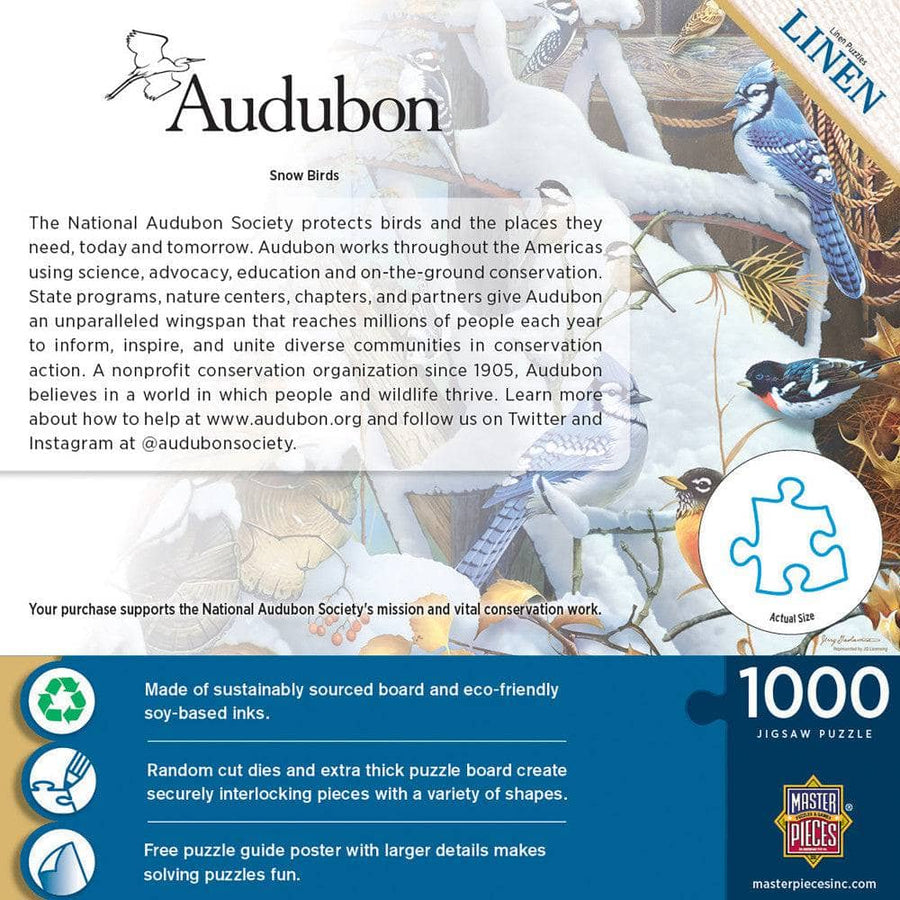 This MasterPieces 19.25" x 26.75" 1000pc Audubon Puzzle is full of colorful beautiful songbirds of North America and sponsored by the National Audubon Society. Winter birds foraging for food.