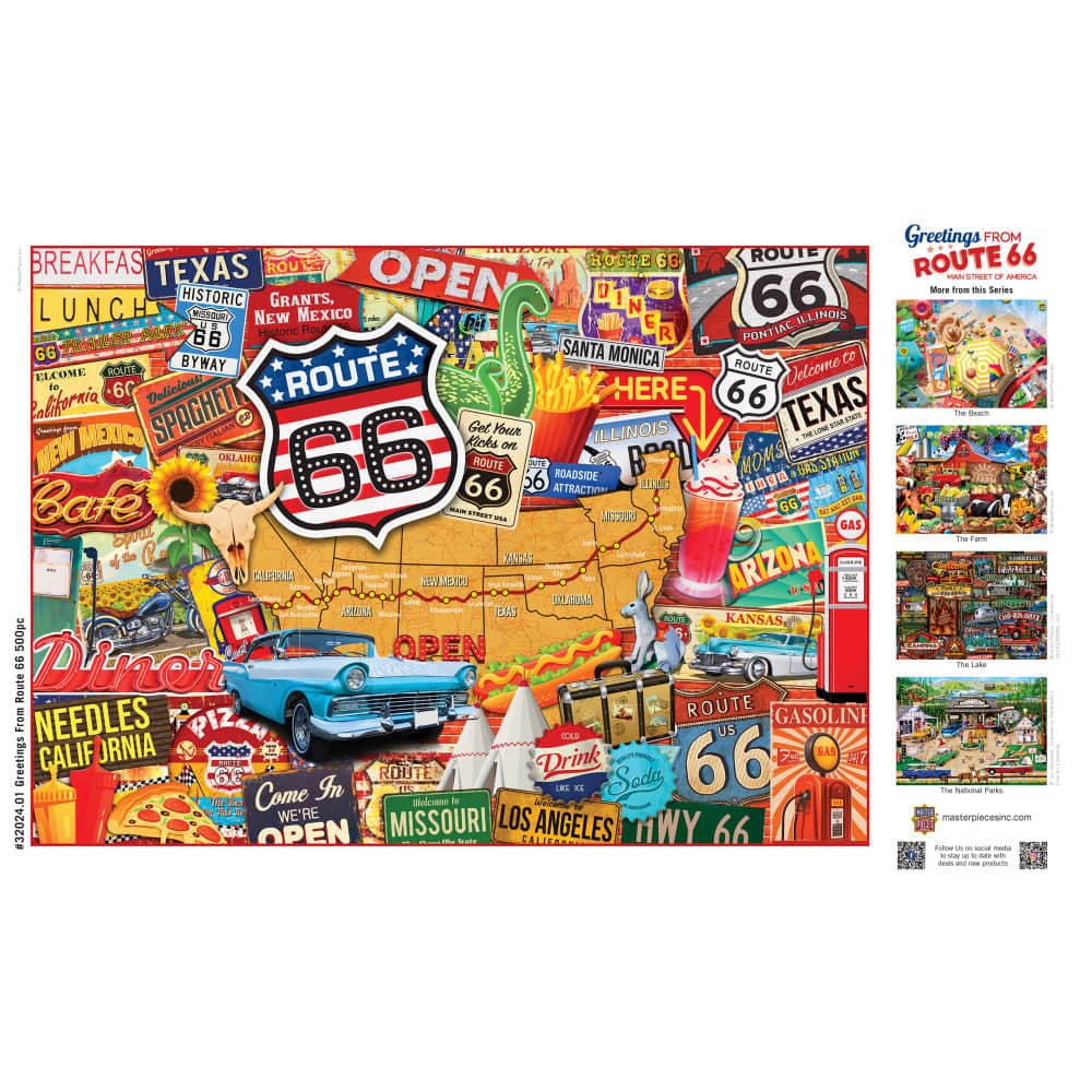 These MasterPieces 21" x 15" 500PC puzzle. Take a trip down Route 66 on the original America's highway To reduce their impact on our environment, the chipboard used in these puzzles is made of 100% recycled material.