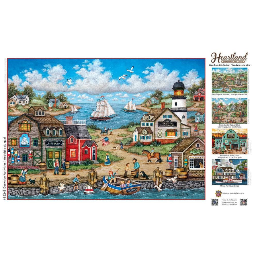These MasterPieces 21" x 15" 500PC Heartland puzzles are created by the talented Bonnie White. It's a beautiful summer's day in this quaint seaside town. While the kids play on the boardwalk, giant ships sail out of the safety of the cove and protection of the bayside lighthouse.. The Heartland line is no exception, with beautiful, detailed scenes ranging from quiet, seaside villages to villages bustling with activity. To reduce their impact on our environment, the chipboard used in these puzzles is made of 100% recycled material.
