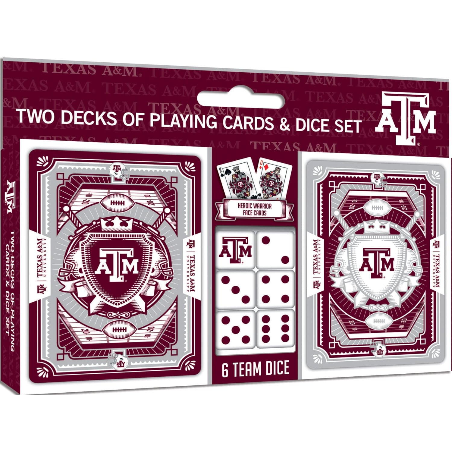 Show your Texas Aggies pride with this officially licensed 2-pack playing cards and dice set, perfect for game nights, tailgates, or as Texas A&M decor in your fan cave. Each deck features 52 custom-designed cards and 2 jokers, all showcasing vibrant team colors and logos, making it a standout among playing cards college fans love. The set also includes 6 standard-size dice, each adorned with the Texas A&M logo, ideal for a variety of classic games. Crafted from durable cardboard, this set is designed for both adults and kids, making it a great addition to Texas A&M merch collections or as a unique gift for any Texas Aggies supporter. The compact, rectangular packaging ensures easy storage and portability, while the custom team designs make it a must-have for anyone seeking Texas A&M apparel or accessories. Whether you’re looking to upgrade your deck cards 2 pack for family gatherings or searching for the perfect complement to your Texas A&M mug, this set delivers both style and team spirit. Enjoy hours of entertainment and show your loyalty with this essential for any fan’s collection.