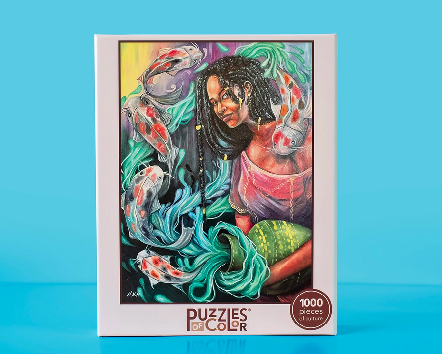 - Dive into the mesmerizing world of "Flow", a remarkable 1000 piece puzzle capturing a breathtaking oil on canvas portrait painting. This captivating artwork explores the enchanting connection between the graceful human form and the vibrant underwater realm. Every piece is meticulously crafted to showcase the delicate depiction of a woman elegantly holding a vase, her eyes transfixing the beholder with serene beauty. Koi fish gracefully swim alongside the woman, symbolizing strength, courage, patience, and success through perseverance. As you piece together this artistic masterpiece, you'll feel a sense of serenity and appreciation for the beautiful bond between humans and the marine world.