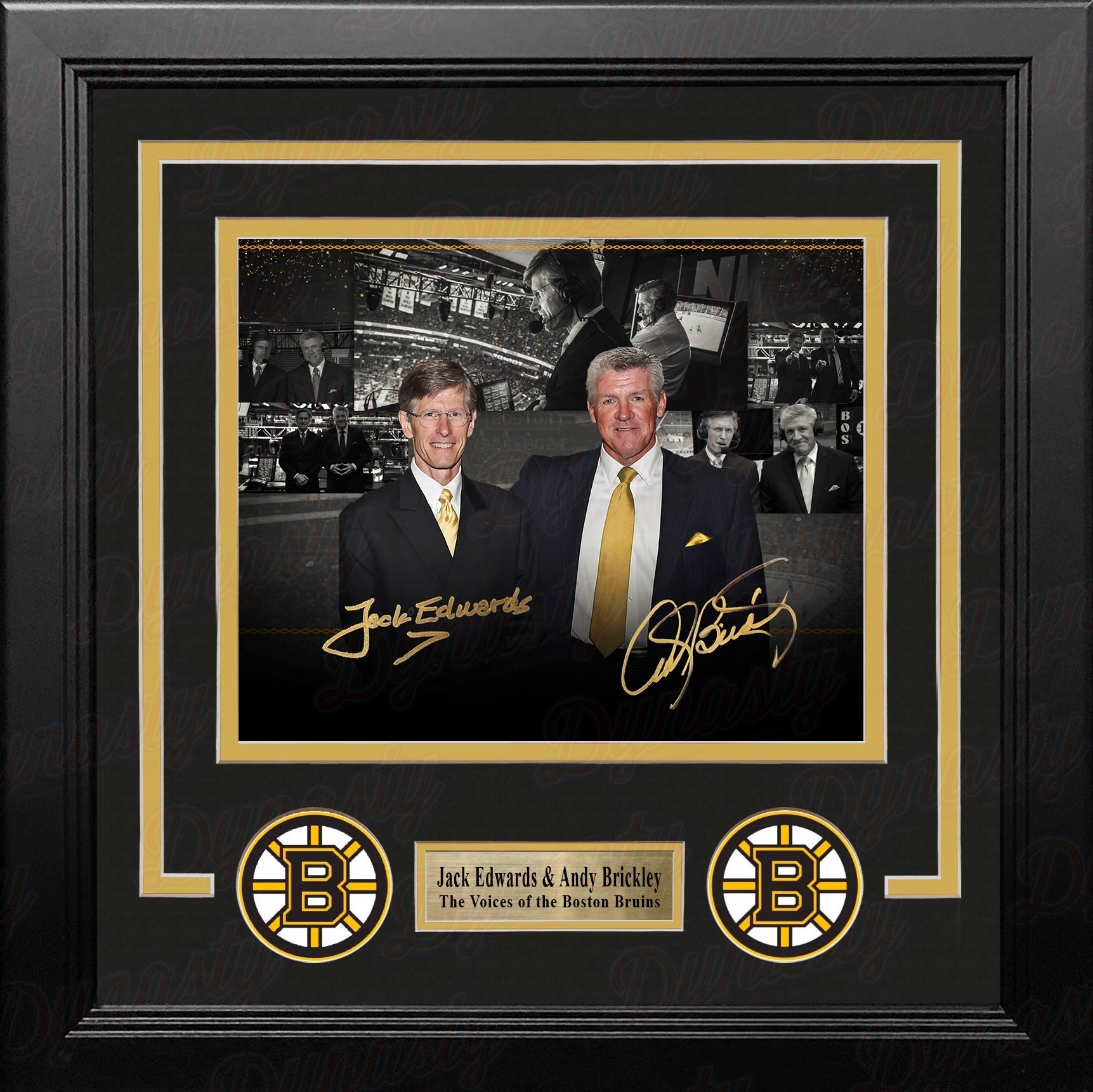 This collage-style hockey photo has been signed by Boston Bruins announcers Jack Edwards & Andy Brickley. It has been authenticated by Dynasty Sports during a public autograph signing