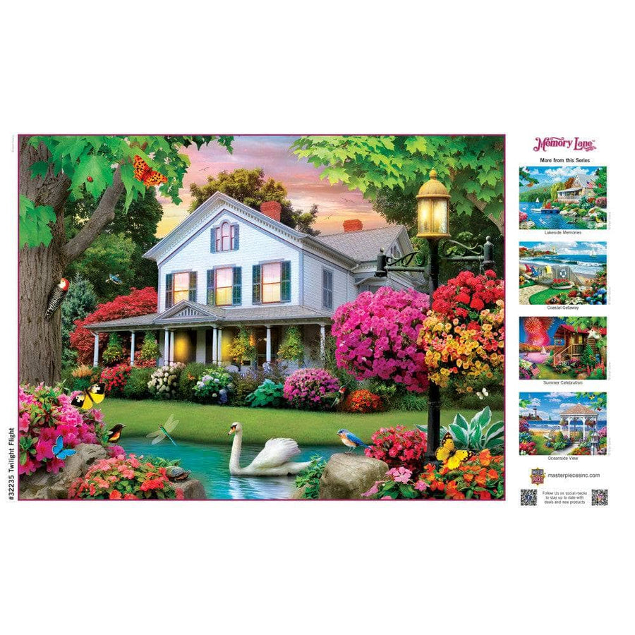 This MasterPieces 18" x 24" Memory Lane 300PC EZ Grip Puzzle depicts A perfect picnic scene outside the barn on a summer day. It was painted by the talented Alan Giana, whose paintings of colorful paths, charming country hideaways, and tranquil coastal gateways are touching the hearts of people everywhere. Country living is at its best in this sublime home nestled against a lovely swan pond. Birds, butterflies, and dragonflies flit and swoop over the water as a single stately swan paddles across the pond. Pull up a porch chair and enjoy a peaceful evening in this colorful scene. The EZ-Grip technology used to make this puzzle offers larger puzzle pieces that snap together perfectly, without compromising image quality. To reduce its impact on our environment, the chipboard used in this puzzle is made of 100% recycled material.