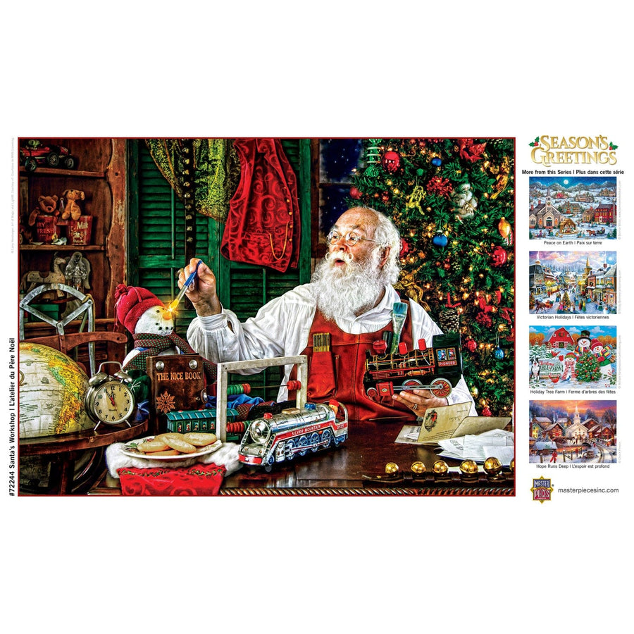 These MasterPieces 19.25" x 26.75" 1000pc of Home for the Holidays features a touch of magic to make toys come to life in Santa's Workshop. The tree is decorated and the toys are made. Santa is putting the finishing touches for good boys and girls.. Holiday Puzzles are the perfect way to get into the holiday spirit, and the perfect holiday presents for friends and family. Cozy up around the table for some holiday family fun! To reduce their impact on our environment, the chipboard used in these puzzles is made of 100% recycled material