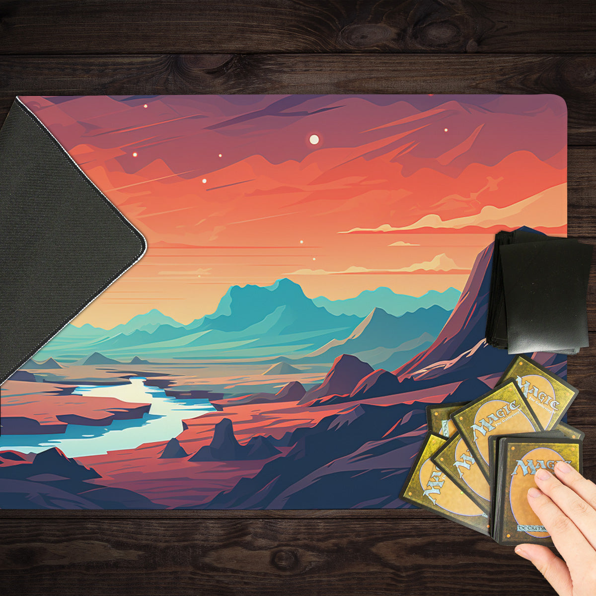 Oversized Playmat measures at 28” x 14” inches and is 1/16 of an inch thick. It’s made with a smooth cloth top and strong rubber backing.