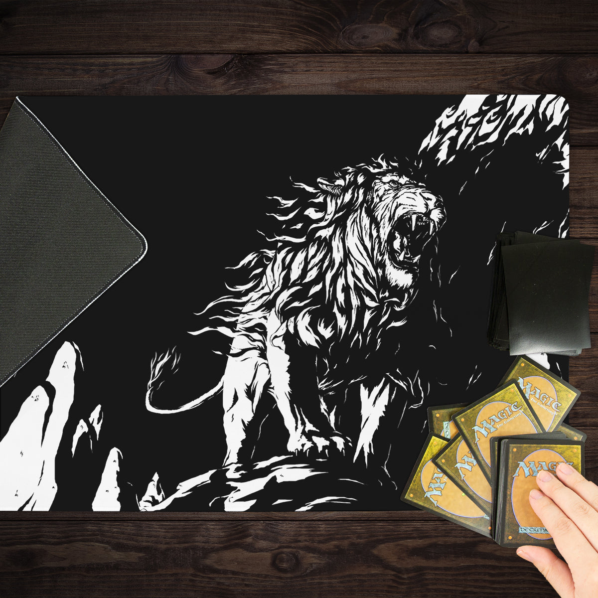 Oversized Playmat measures at 28” x 14” inches and is 1/16 of an inch thick. It’s made with a smooth cloth top and strong rubber backing.