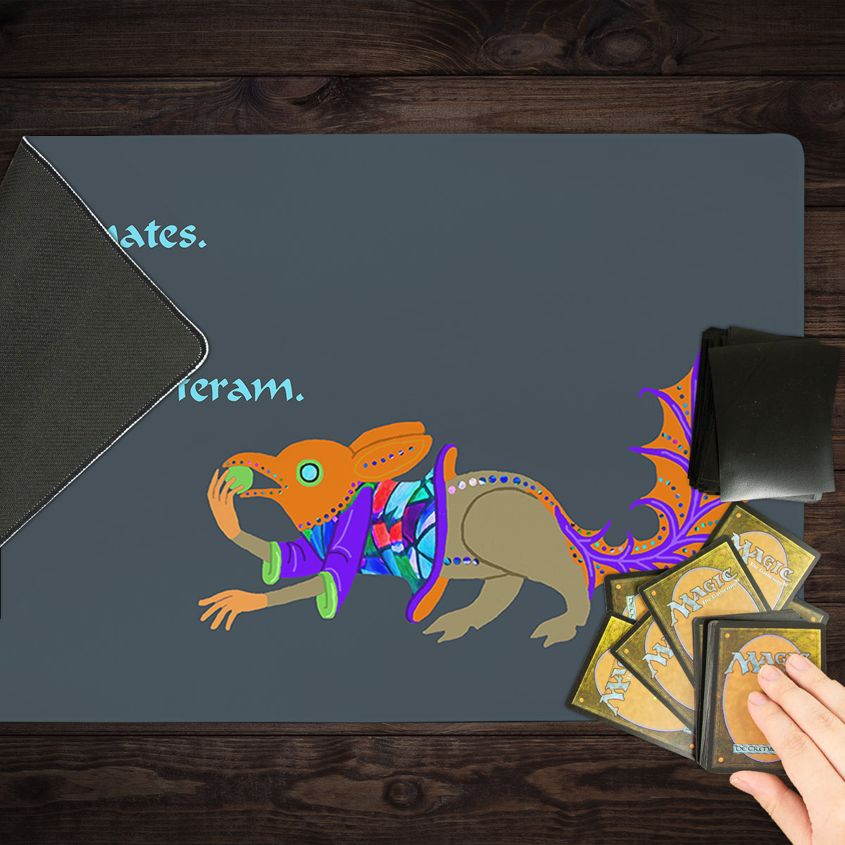 Standard Playmat measures at 24” x 14” inches and is 1/16 of an inch thick. It’s made with a smooth cloth top and strong rubber backing.