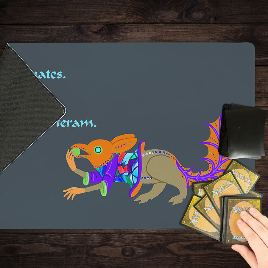 Oversized Playmat measures at 28” x 14” inches and is 1/16 of an inch thick. It’s made with a smooth cloth top and strong rubber backing.