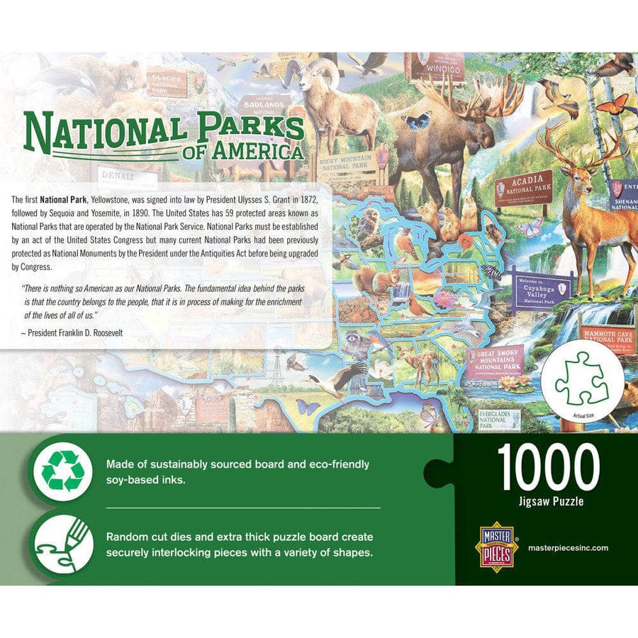 This Masterpieces 1000pc Puzzle of the National Parks of America features map of all the National Parks each showing something special in the area. Seek out illustrations of unique animals and places around the states. Each custom-crafted map is incredibly detailed, showing historic places, popular attractions, indigenous wildlife, mountain ranges and much more. These puzzles are made on the highest quality 100% recycled puzzle board and packaged in sophisticated matte-finish display boxes.