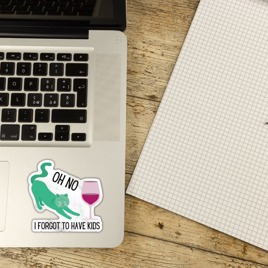 Reads: "Oh No I Forgot To Have Kids" with cat and wine design.