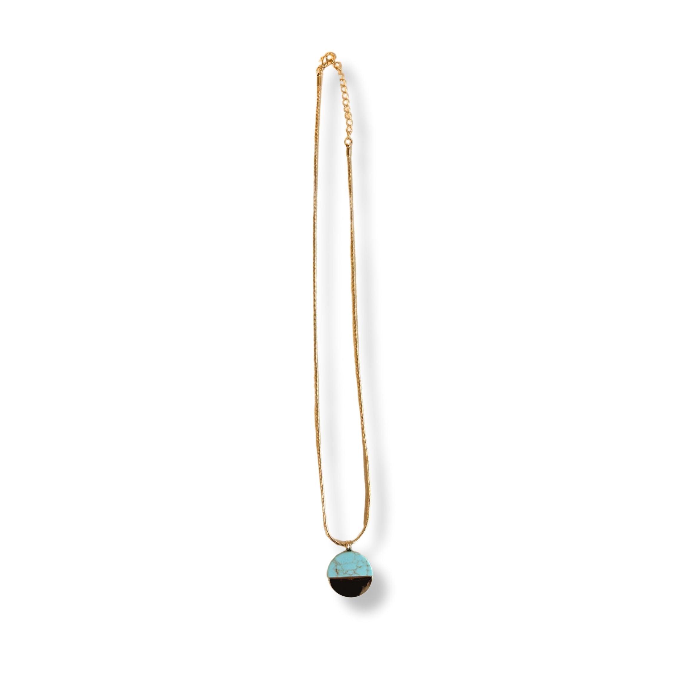 Elevate your everyday look with the Turquoise Disc Necklace, a modern yet earthy piece that brings balance and style to any outfit. Featuring a round pendant with a striking half-turquoise, half-metal design, this necklace blends natural stone with sleek shine for a clean, minimalist statement.