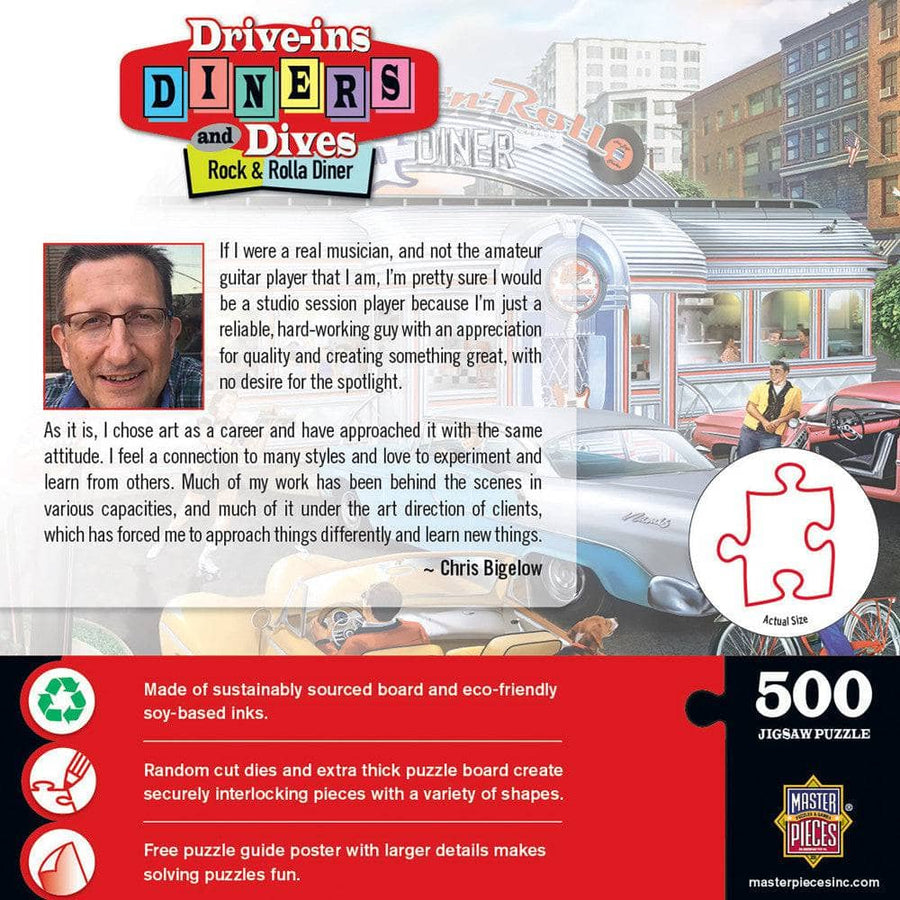 This MasterPieces 21" x 15" 500PC of Drive-Ins, Diners and Dives is perfect for all vintage car fanatics! The Rock 'n Rolla Diner is hopping and bopping. This puzzle is the perfect gift for anyone who appreciates the good old days! To reduce its impact on our environment, the chipboard used in this puzzle is made of recycled material.