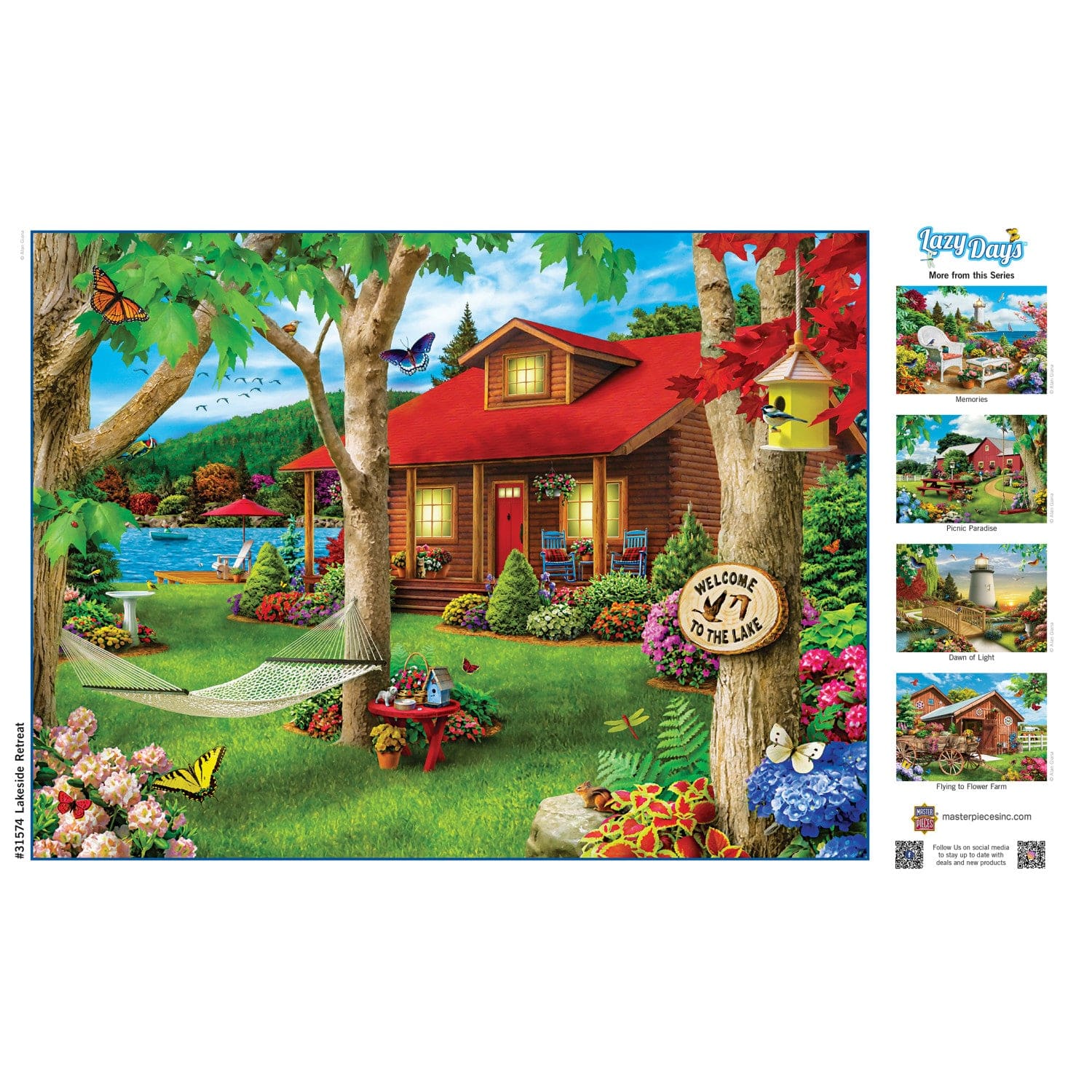This MasterPieces 18" x 24" 750pc Lazy Days Puzzle was created by the talented Alan Giana. Alan Giana's paintings of colorful paths, charming country hideaways, and tranquil coastal waterways touch the hearts of people everywhere. His inspiring paintings now appear on hundreds of products sold all around the world. Alan lives with his loving wife, Pamela, in the picturesque town of Simsbury, Connecticut. Lazy Days puzzles are full of breathtaking scenery and effortless beauty. This image features a picturesque cabin by the lake, with a colorful garden, a hummingbird feeder, and a hammock in the front yard. To reduce its impact on our environment, the chipboard used in this puzzle is made of 100% recycled material.