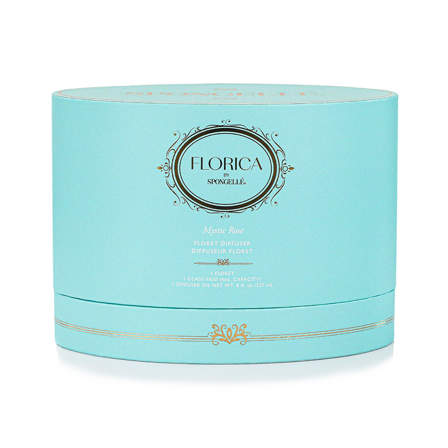 Enjoy an aromatic ambiance in any room with Spongellé’s Mystic Rose Diffuser. Open the bottle and carefully pour the diffuser oil into the vase, filling below the rim (approximately 6oz). We recommend using plastic gloves. Insert the Floret’s cotton cord into the vase so the Floret rests on the top of the vase. Wait 24-48 hours for the fragrance to release and the new Floret color to appear. As the Floret blooms and fragrance dissipates with time, you may carefully lift the flower (using gloves) and add the remaining oil to the vase. You can refresh with a new Floret and fragrance while keeping the vase for continued use.