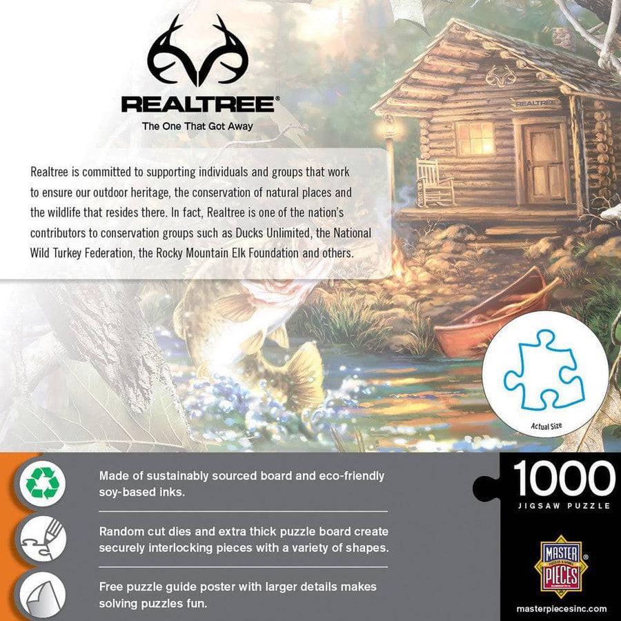 These MasterPieces 19.25" x 26.75" 1000pc Realtree Puzzle of The One That Got Away features a cabin scene right in front of a river with the jumping trout. This was beautifully painted by artist, Dona Gelsinger. Gelsinger is inspired by the natural beauty and abundant wildlife throughout her hometown in the Rogue River Valley of Southern Oregon. She brings nature to life with her keen eye and practiced strokes, making you feel as if you're right there, taking a peek at nature's most magnificent creatures. Hand painted artwork by Dona Gelsinger is combined with exact Realtree patterns to create a one-of-a-kind image. To reduce their impact on our environment, the chipboard used in these puzzles is made of 100% recycled material.