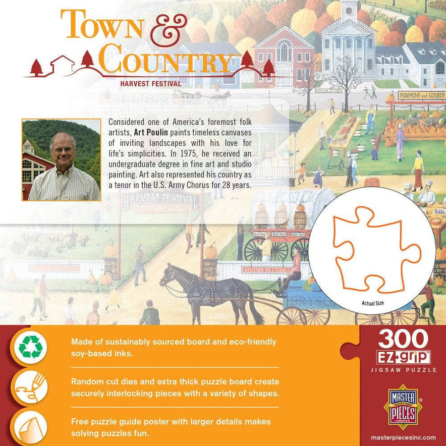This MasterPieces 18" x 24" 300PC EZ Grip Town & Country Puzzle is the perfect way to sit back, relax, and enjoy the simple pleasures in life. With featured art of the incredibly talented folk artist, Art Poulin. Summer comes to a close with the start of the Harvest Festival . The EZ-Grip die-cut used to make this puzzle offers larger puzzle pieces for easier visual and grip that snap together perfectly, without compromising image quality. To reduce their impact on our environment, the chipboard used in these puzzles is made of 100% recycled material.
