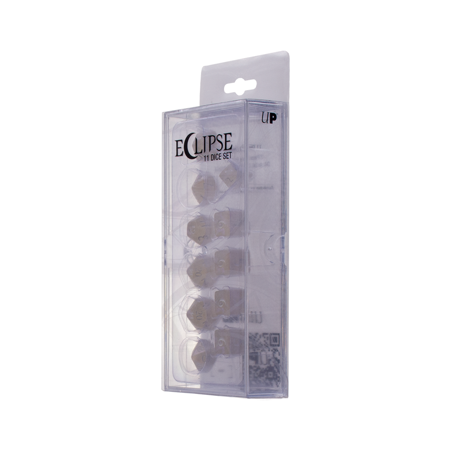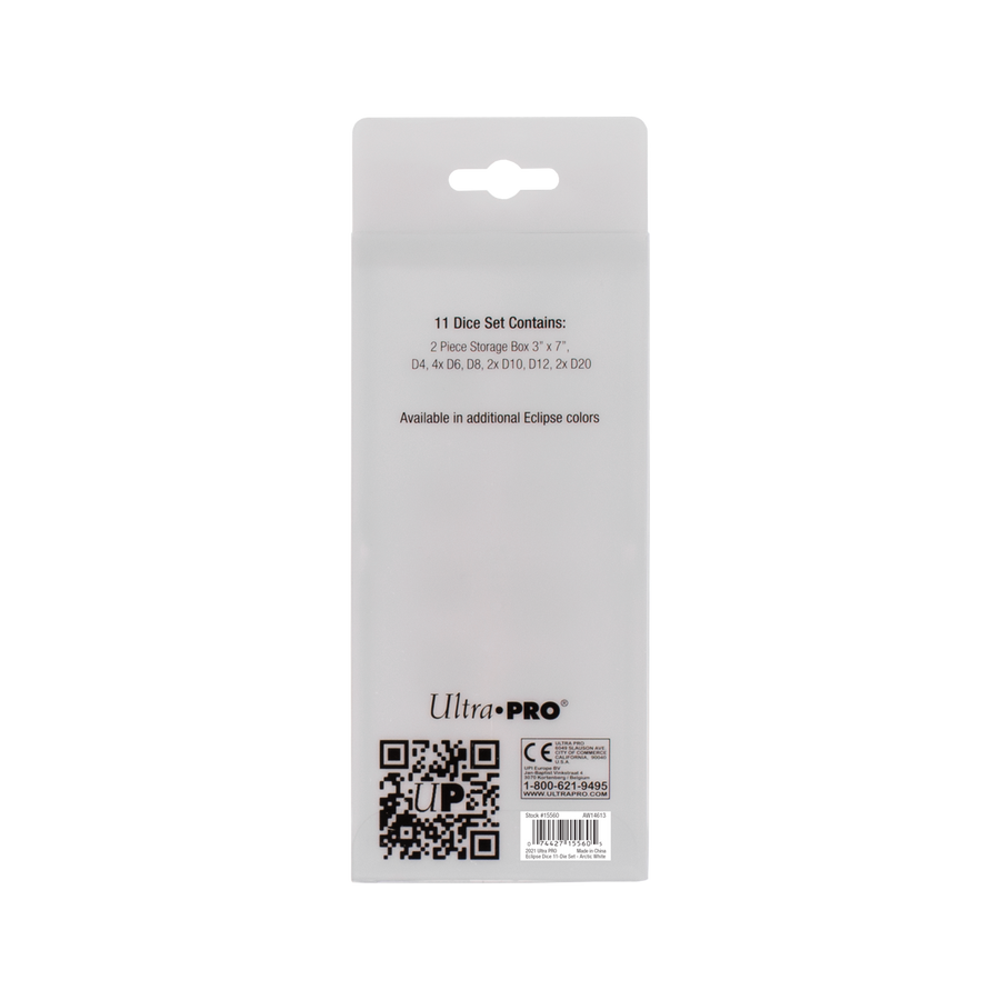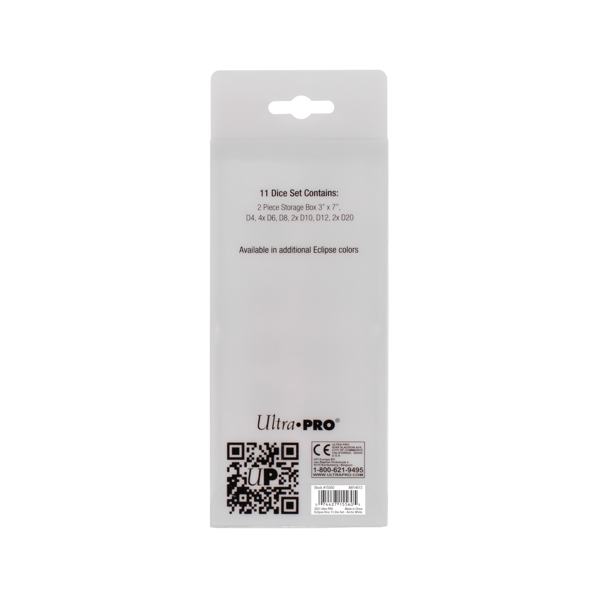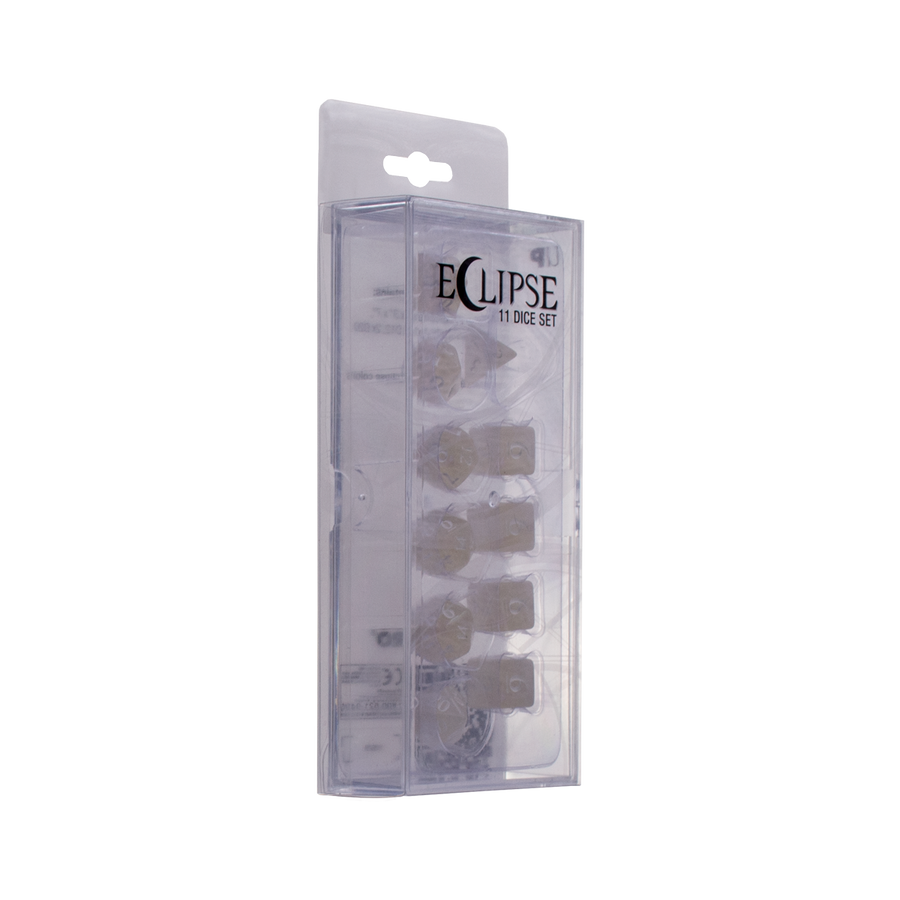 The Eclipse 11 Dice Set is a gamer's best friend! While most RPG dice sets include only the polyhedral 7, Ultra PRO is here to help you UP your game with additional dice needed for modern RPG games. Each set includes D4, 4x D6, D8, 2x D10, D12, and 2x D20. The dice come in a 2-piece acrylic storage box with enough space for up to 40 dice, and sized to fit pens, markers, or other small RPG accessories. Eclipse Dice feature a shimmering finish that makes every roll magical! Aligned with the 12 Eclipse colors, these dice are the perfect companion for the 100+ Deck Boxes, Matte or Gloss sleeves, and PRO-Binders.
